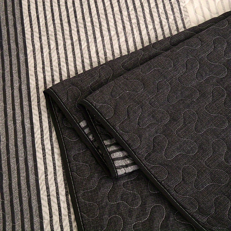 3-Piece Brushed Bedspread Set in Black Grey White Stripes with Pillowcases for Bedroom and Guest Room