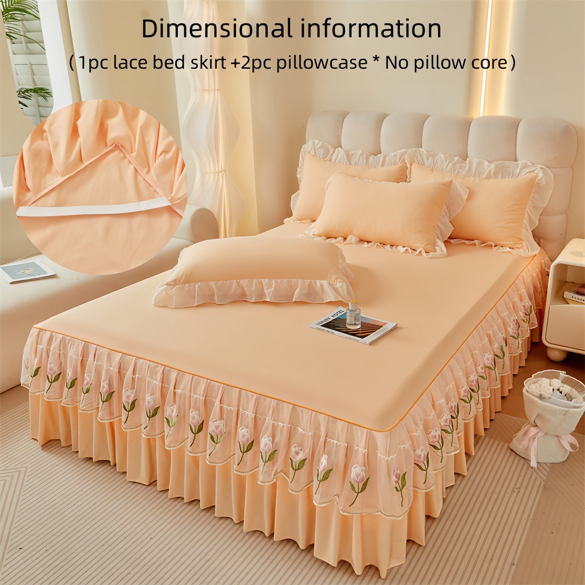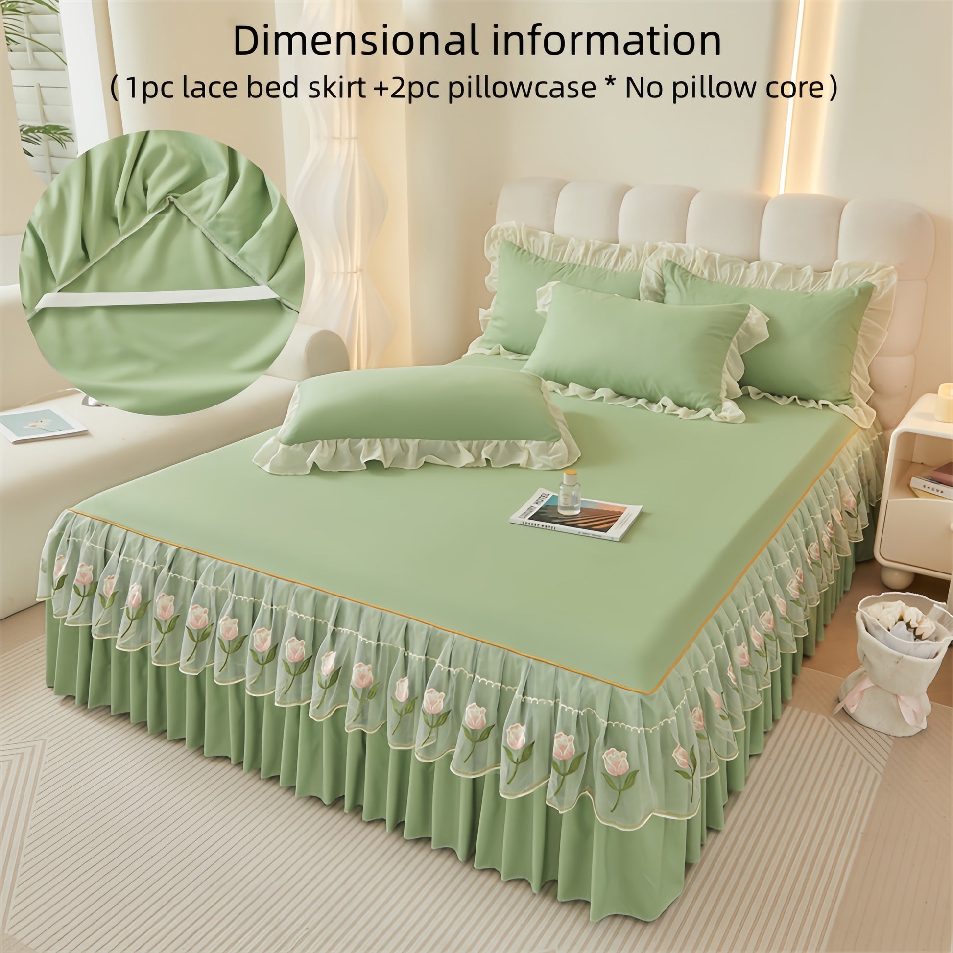 3pcs Embroidered Bed Skirt Set with Rose Lace Ruffles Polyester Includes Lace Bed Skirt and Lotus Leaf Pillowcases for Bedroom Guest Room