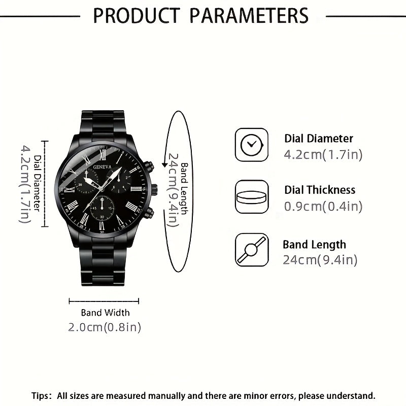Men's Stainless Steel Business Watch Set with Quartz Dial Necklace Bracelet Ring
