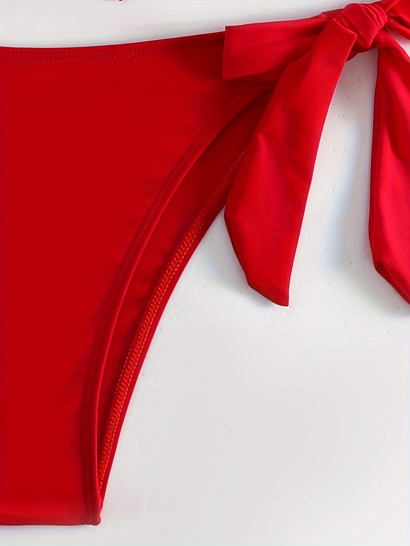 Red Solid Color Bikini Set with Lace Up Halter Neck and High Stretch Fabric