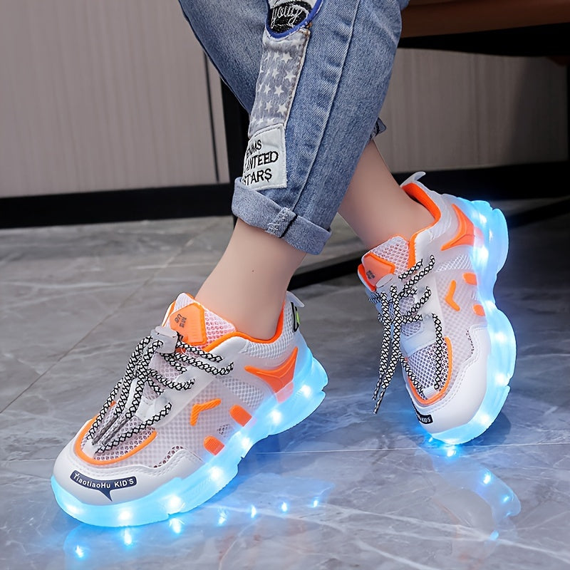 Kids LED Light-Up Sneakers Breathable Mesh Non-Slip Soft Sole for Boys Girls Toddler Children in White Blue Orange