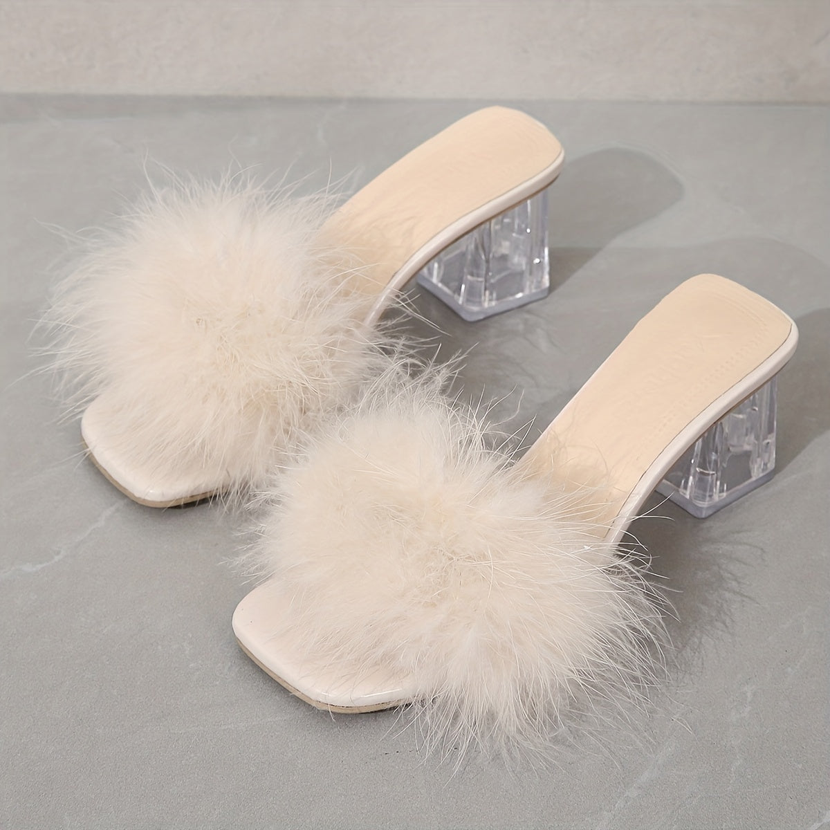 Women's Faux Fur Decor Chunky Heel Sandals Square Toe Slip-On Summer Dress Shoes