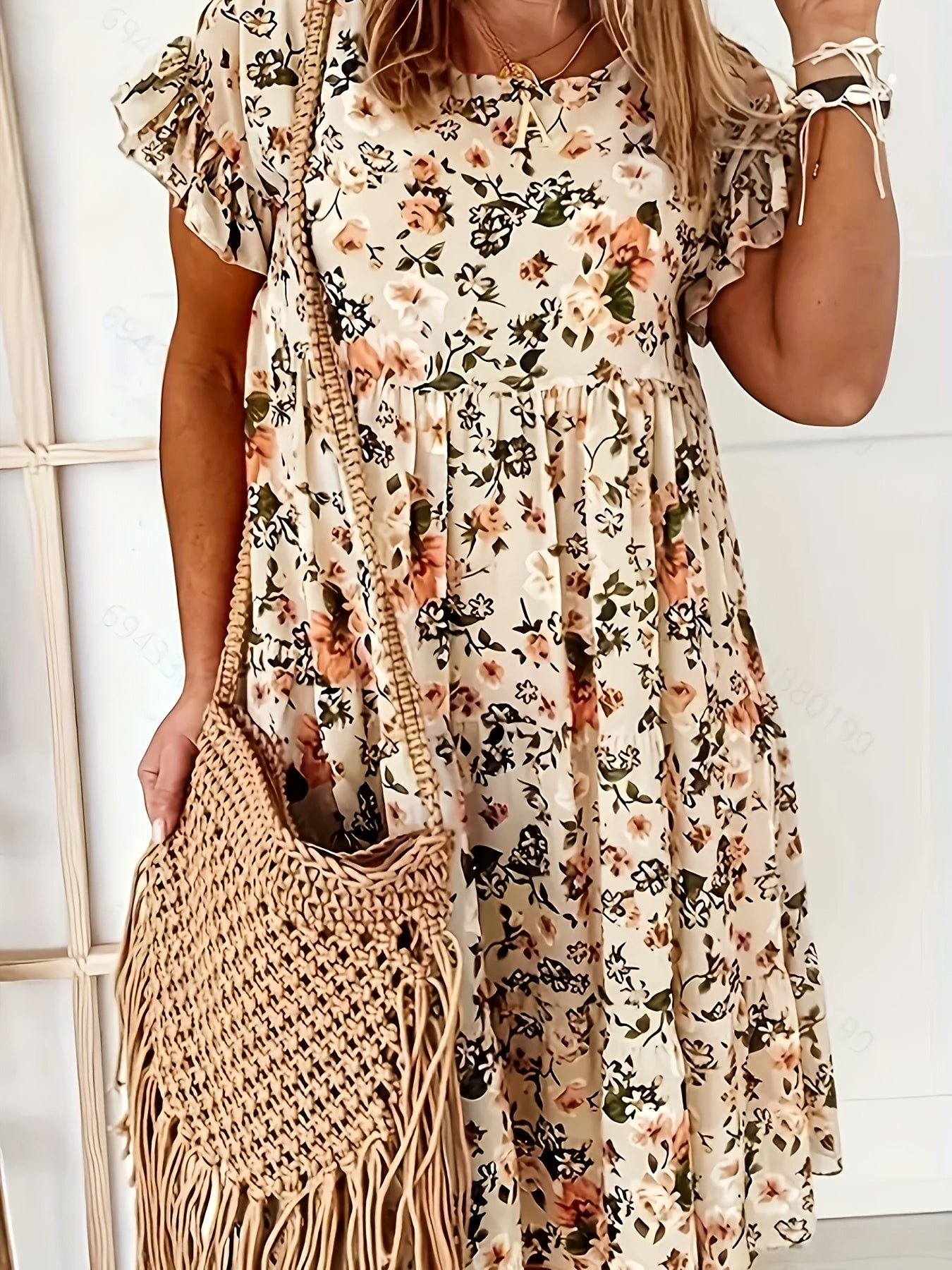 Plus Size Navy Blue Floral Print Dress with Ruffle Detail for Spring and Summer