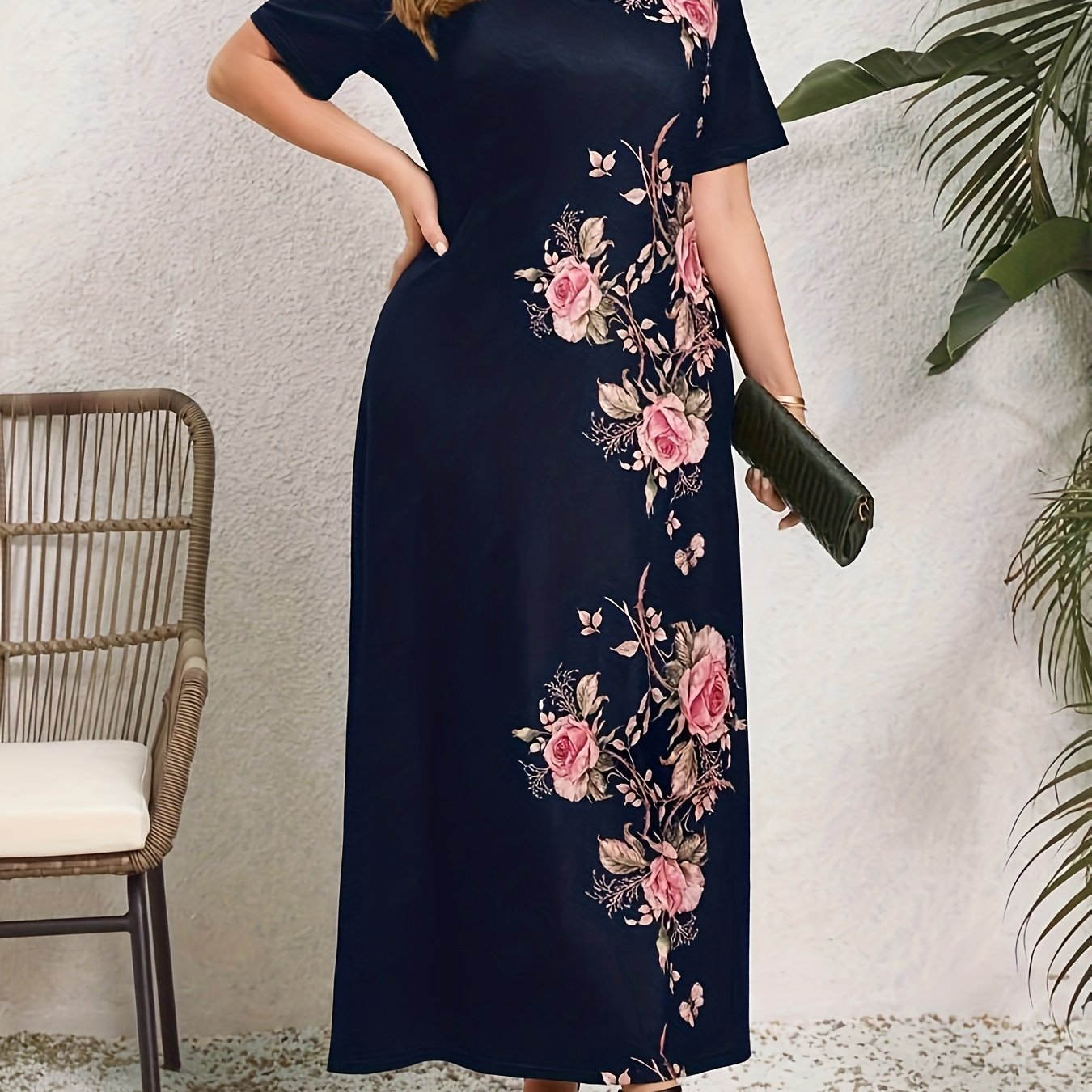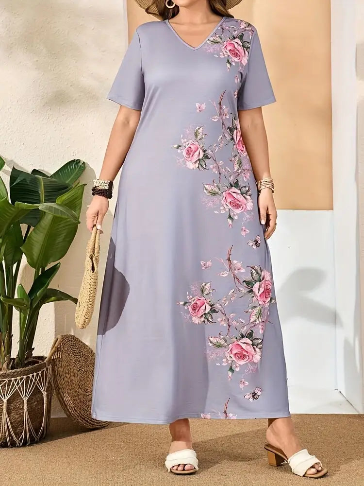 Plus Size Floral Print Slim Dress V-Neck Short Sleeve for Spring Summer Vacation