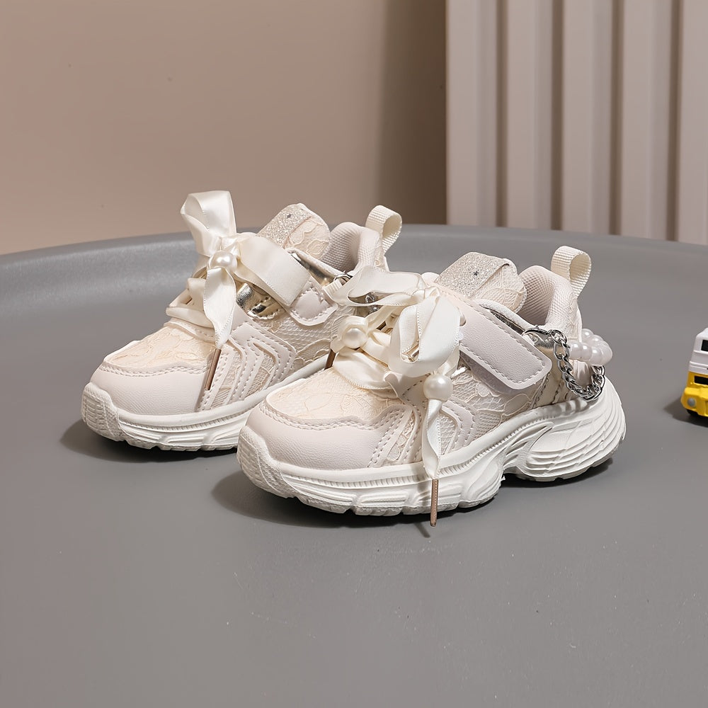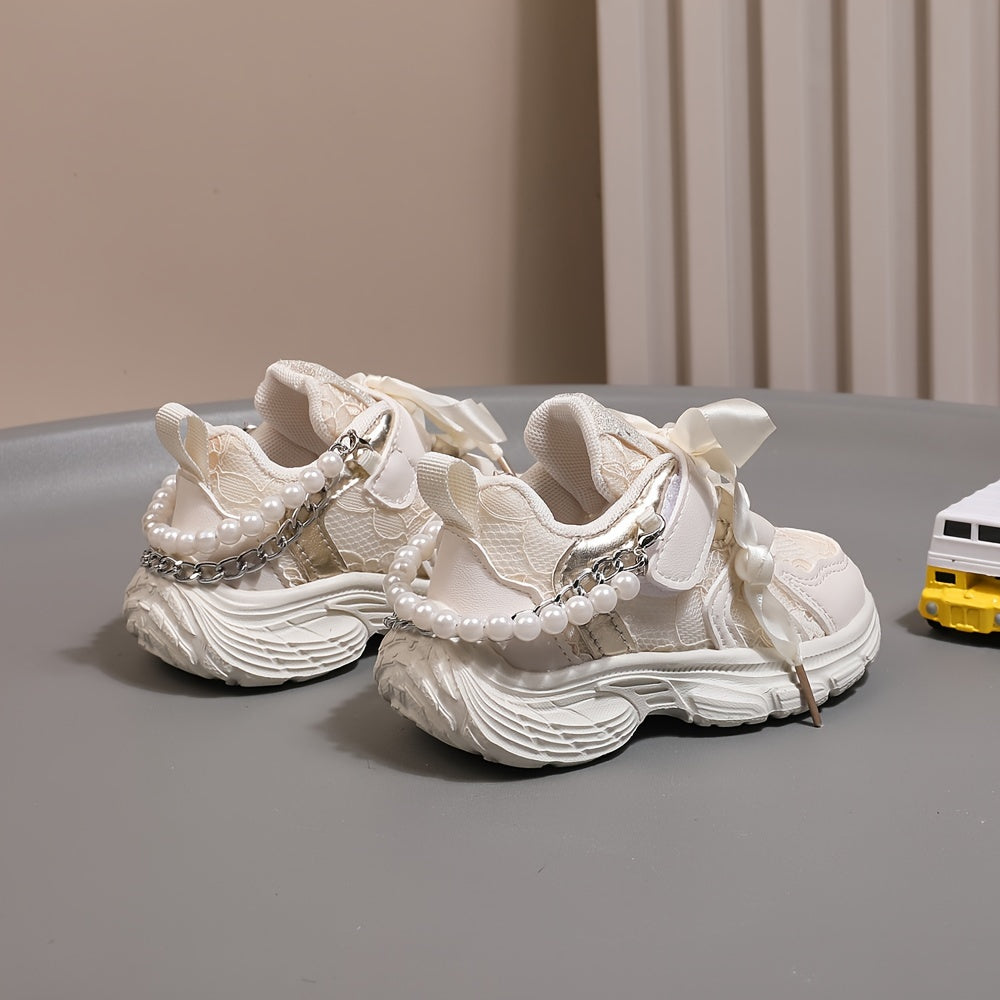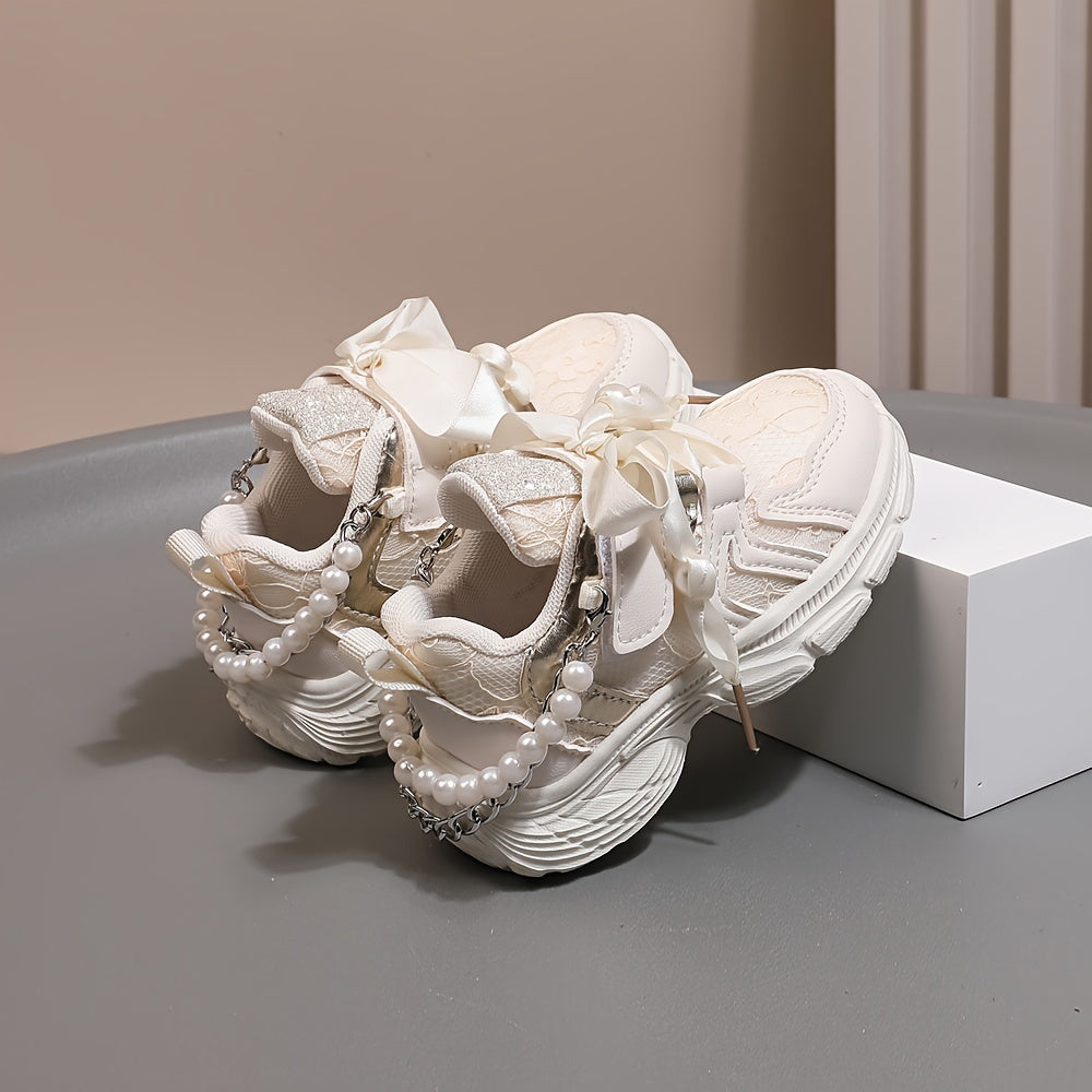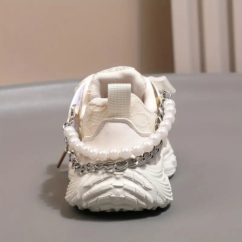 Girls Casual Pearl Chain Low Top Sneakers for Spring and Fall Non-Slip Sport Shoes