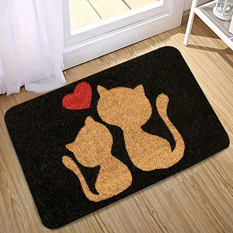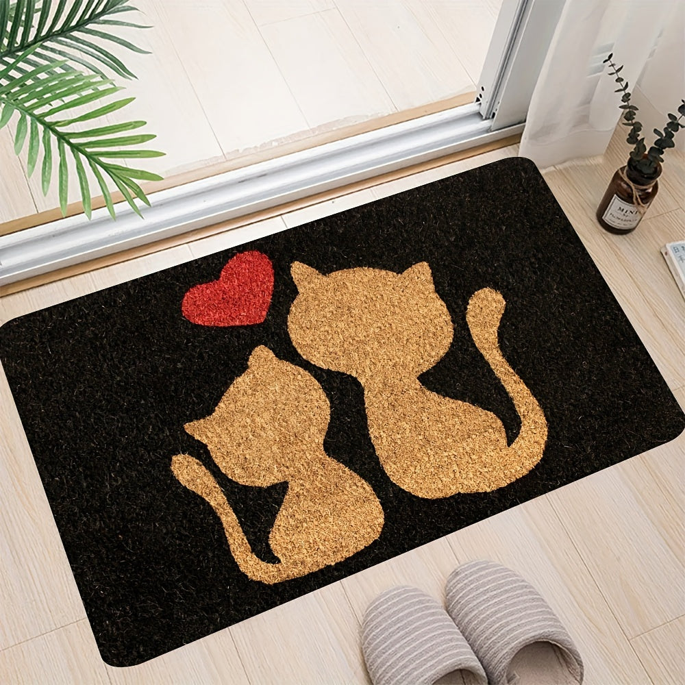 Heart Design Doormat with Cute Cat, Easy to Clean, Machine Washable, Rectangular Rug for Entryway