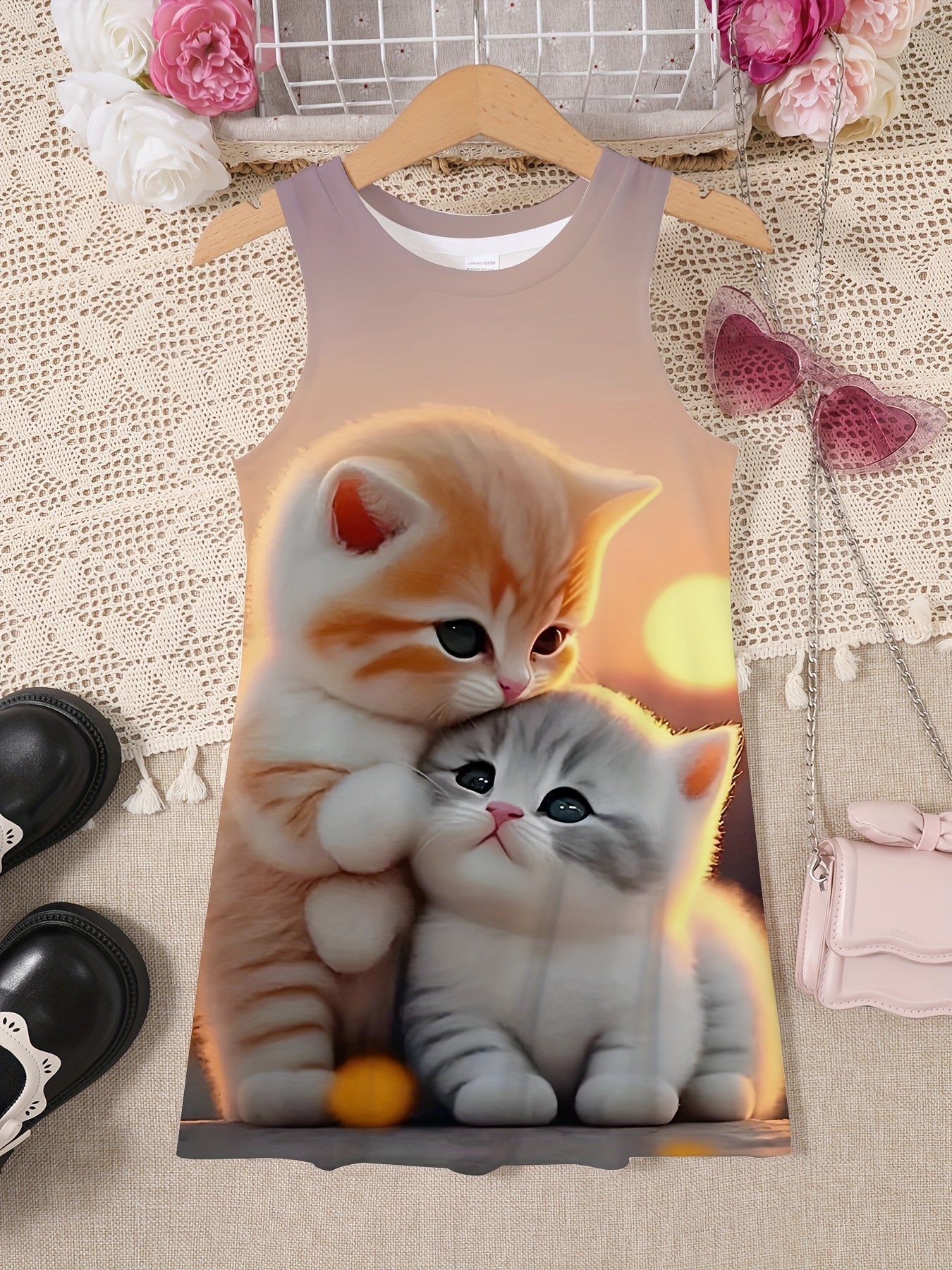 Kids Girls Sleeveless Dress with Kitten and Sunset Print for Summer and Spring