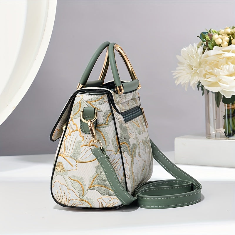 Large Capacity Floral Embroidered Crossbody Bag with Zipper Closure and Polyester Lining