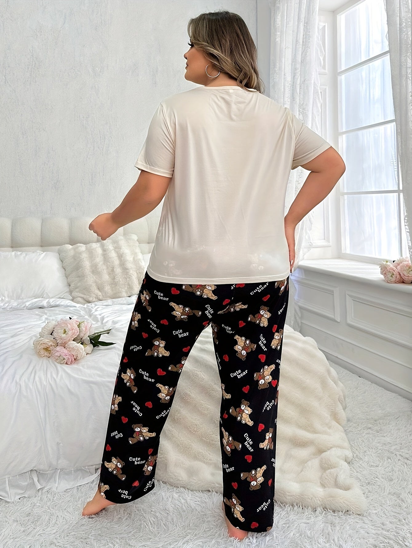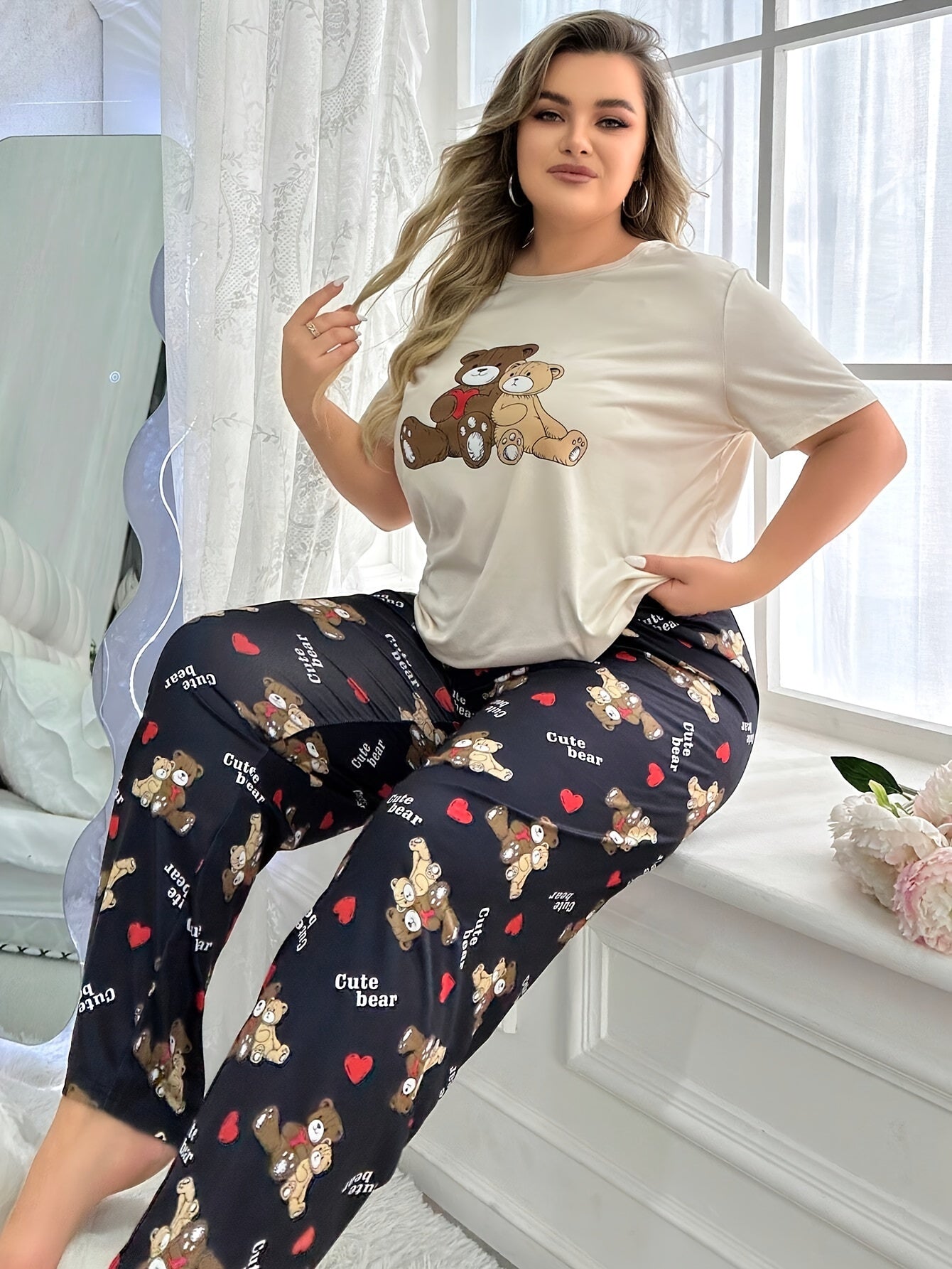 Adult Pajama Set with Double Teddy Bears, Polyester Knit, Casual Style