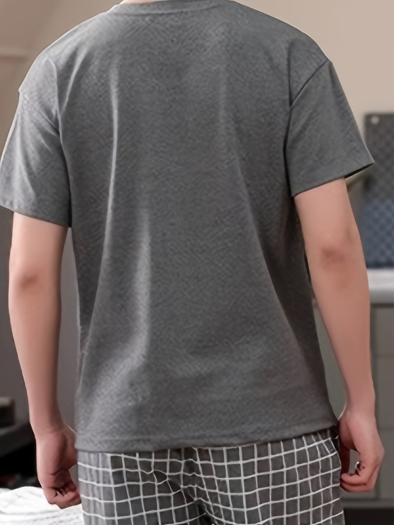Men's Plaid Pajama Set Short Sleeve Crew Neck Lounge Wear Polyester Comfortable