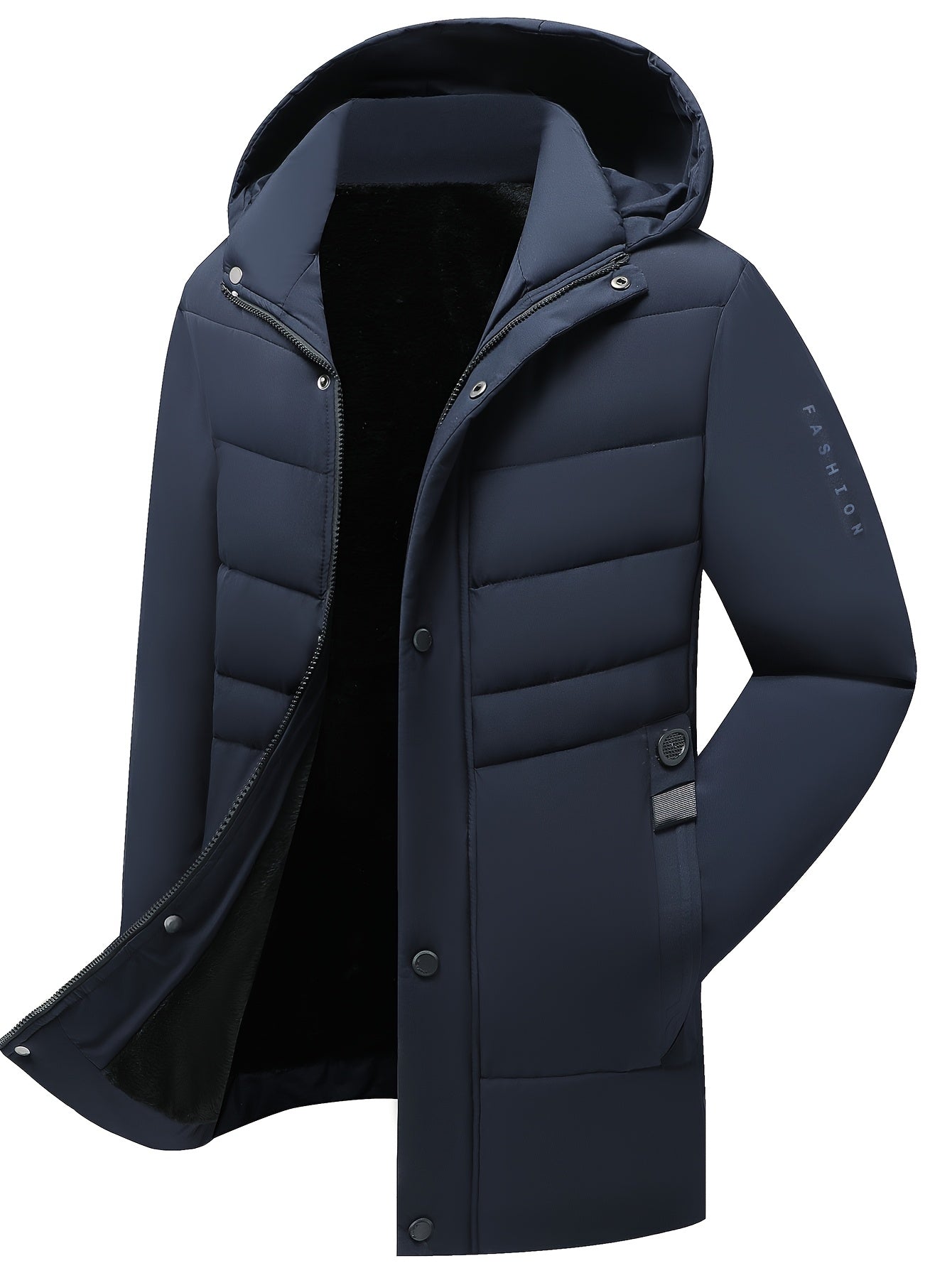 Men's Navy Blue Fleece-Lined Mid-Length Zip-Up Hooded Jacket with Pockets