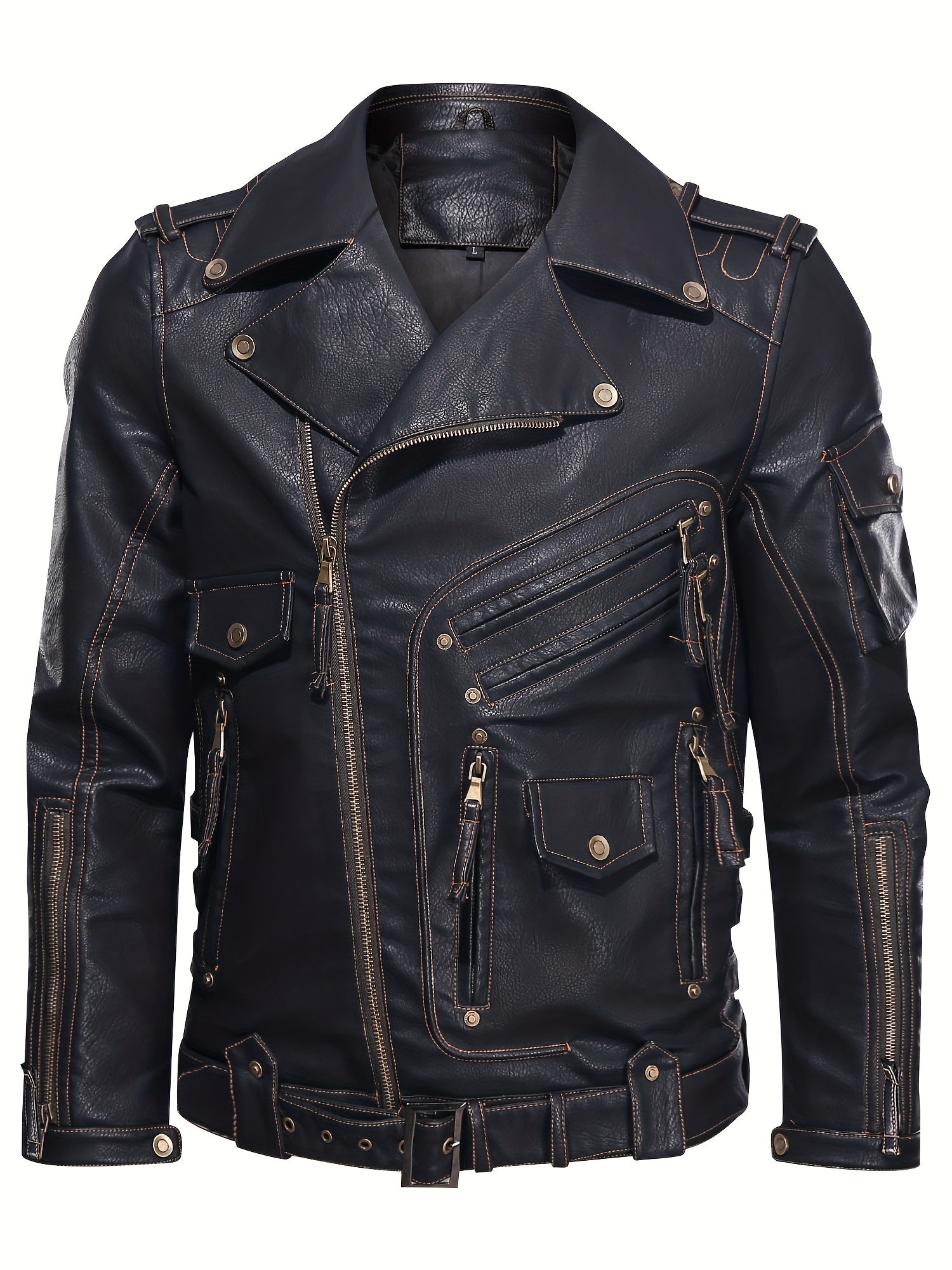 Men's Black Biker Jacket with Zipper Pockets Studded Details Polyester Lining Loose Fit Spring Fall