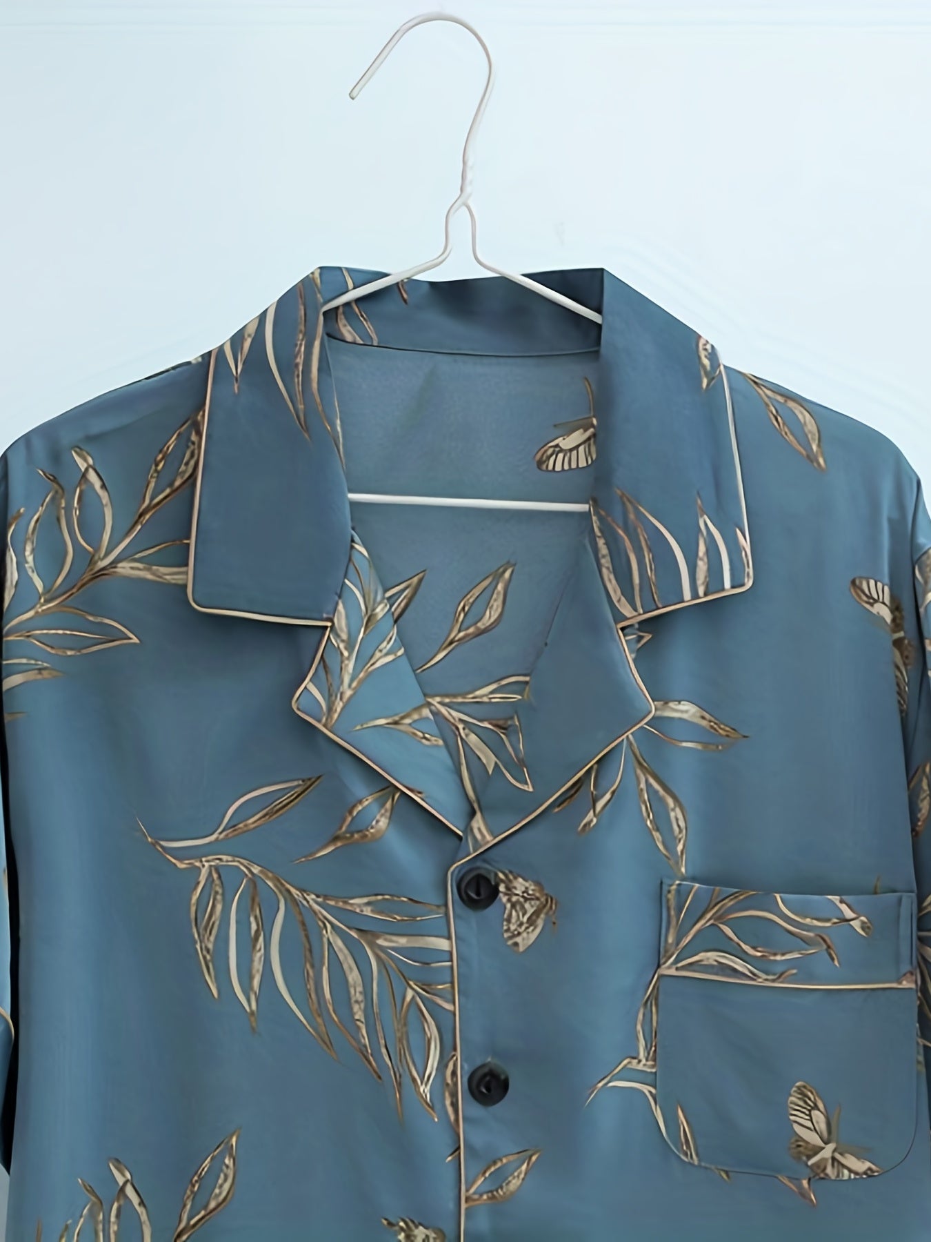 Men's Summer Floral Pajama Set Short Sleeve Lapel Collar Polyester Elastane Black