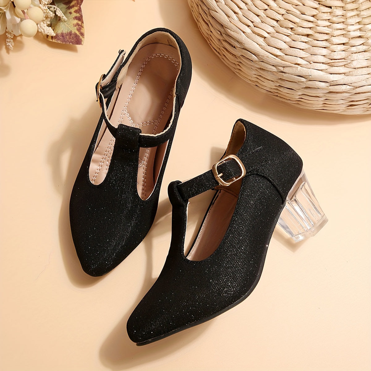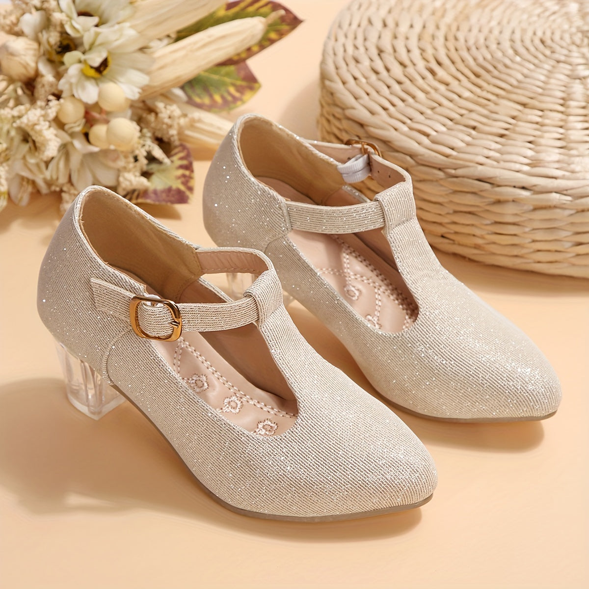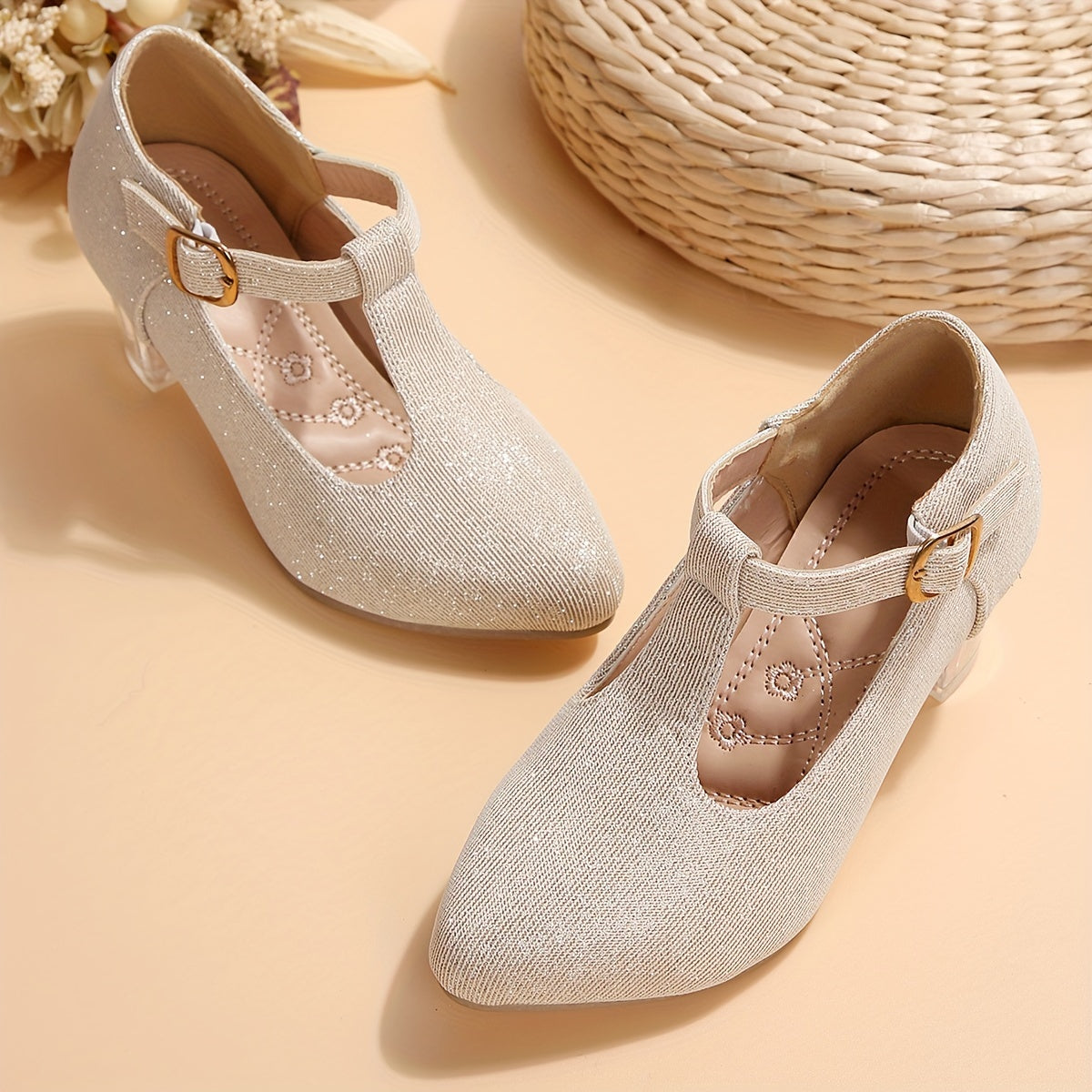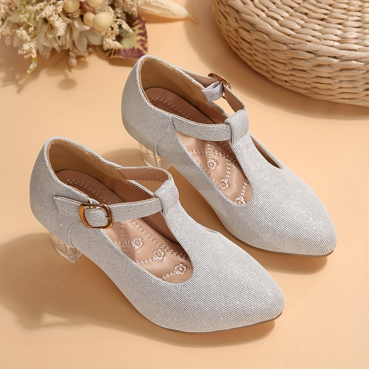 Girls High Heeled Shoes Spring Autumn Embroidered Flower Glitter PVC Pointed Toe