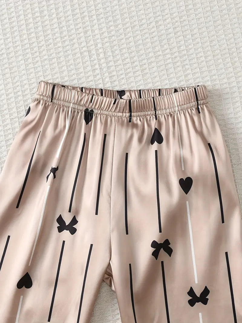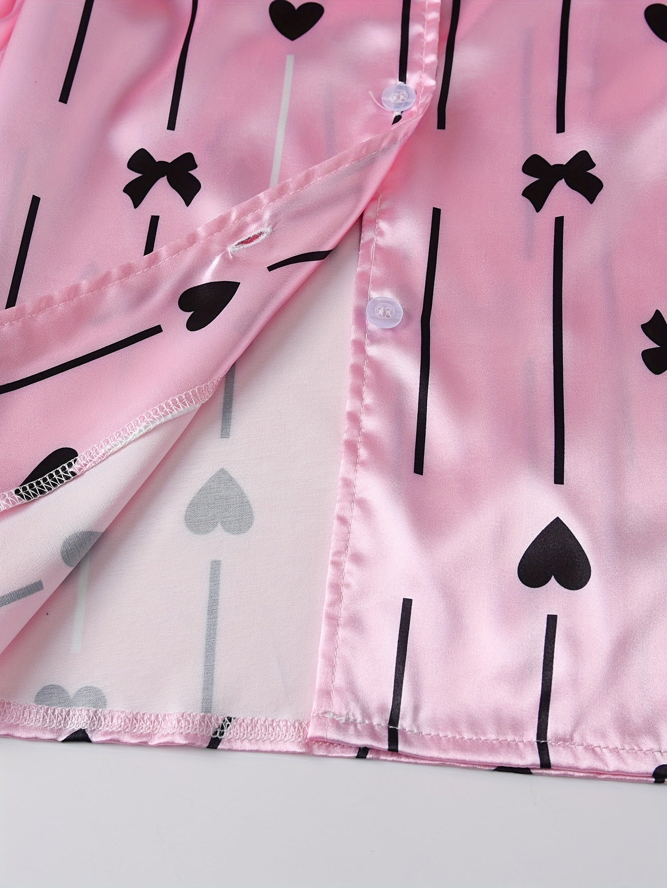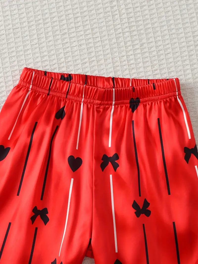 Girls Pajama Set with Heart-Shaped Bow Striped Floral Print Long Sleeve Cotton Casual
