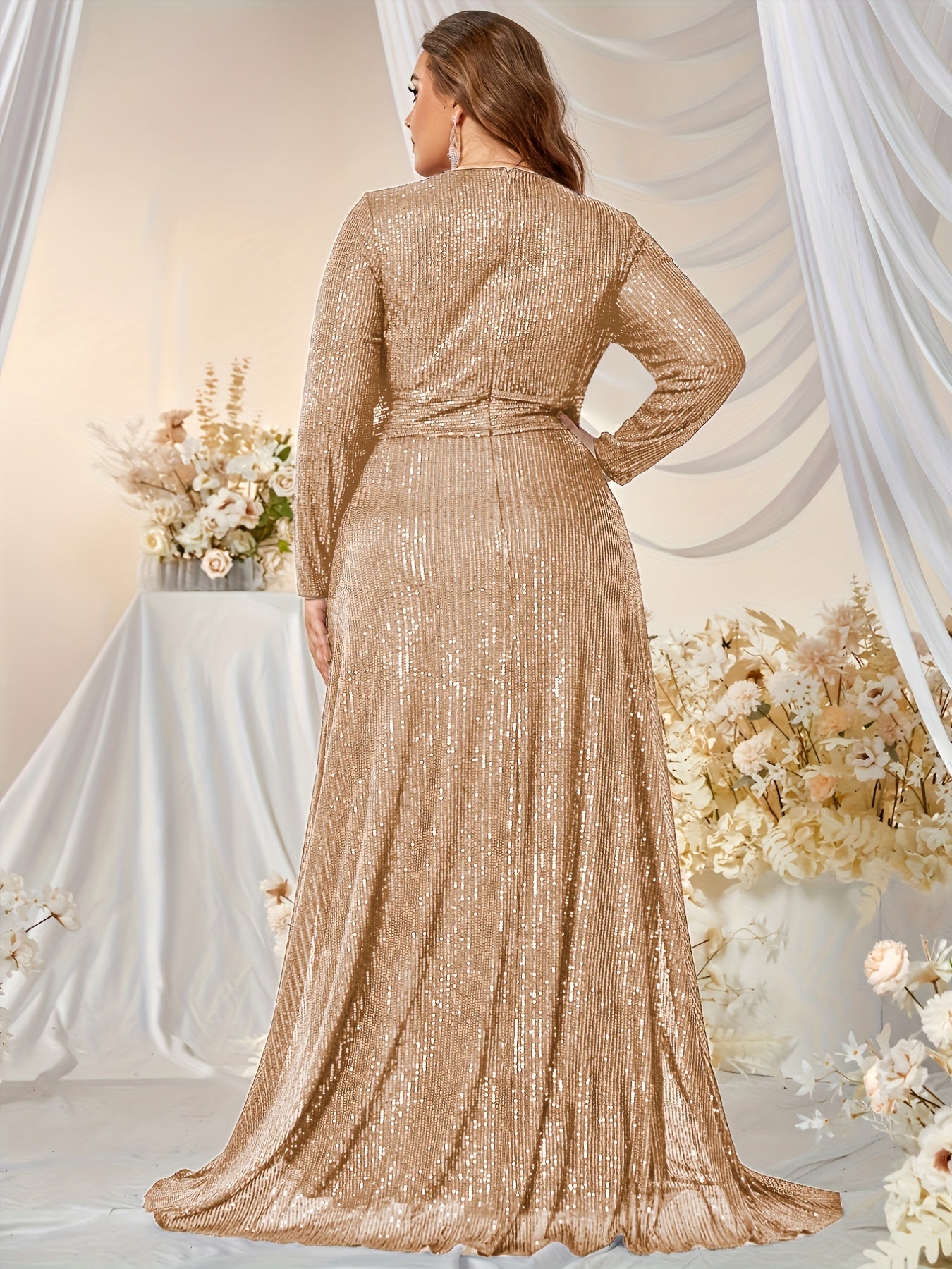 Plus Size Black Sequin V-Neck Evening Gown Long Sleeve Formal Dress