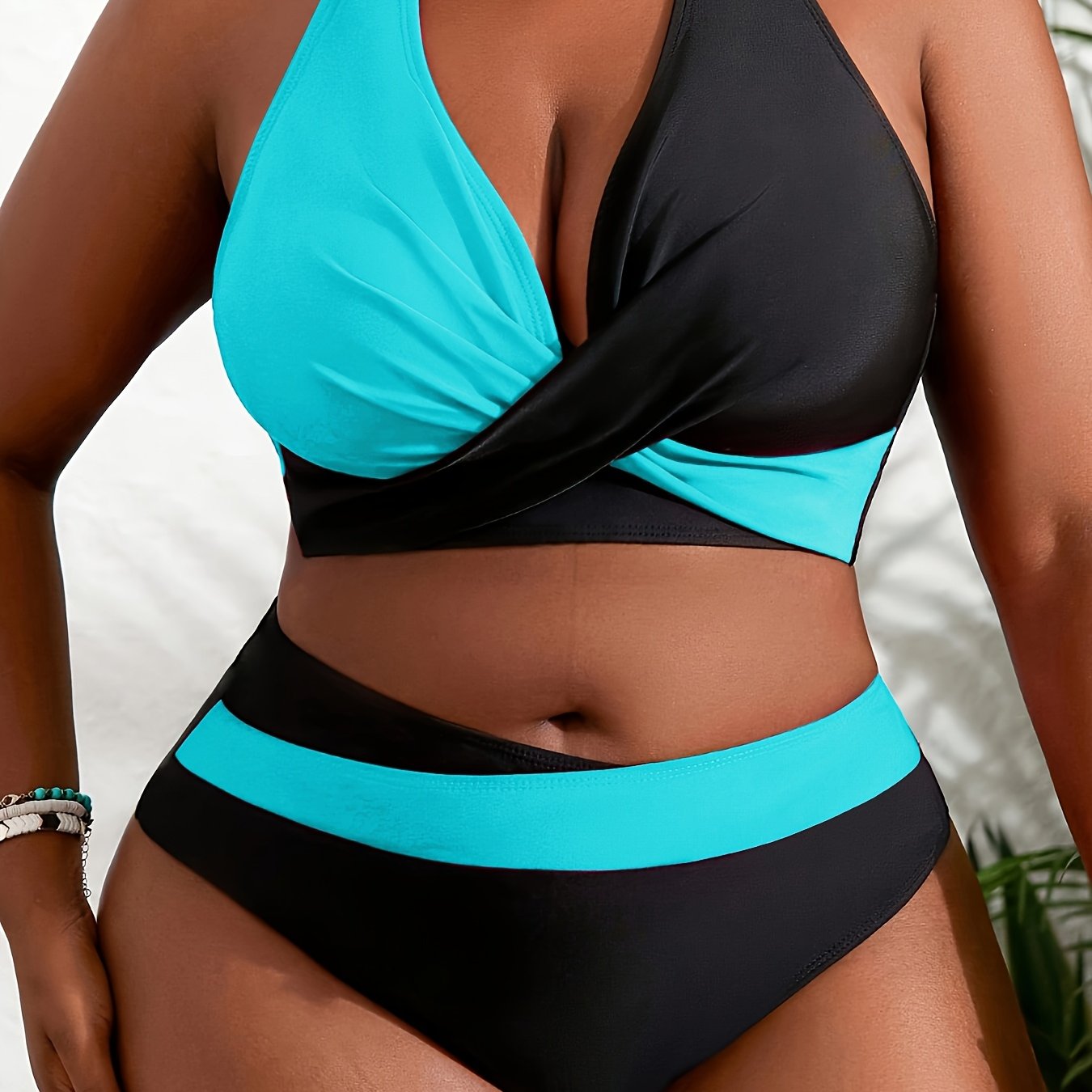 Plus-Size Women's Color Block V-Neck Bikini Set with Removable Padding