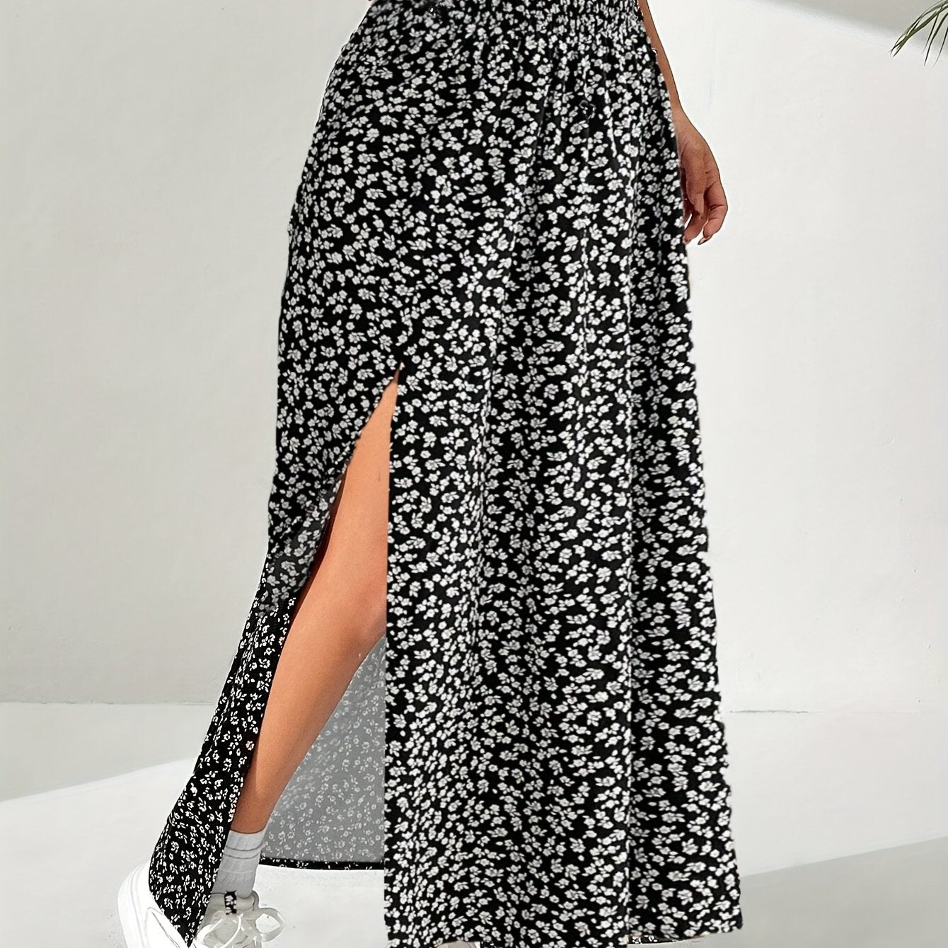 Plus Size Women's Floral A-Line Skirt With High Thigh Slit Black White Summer Vacation