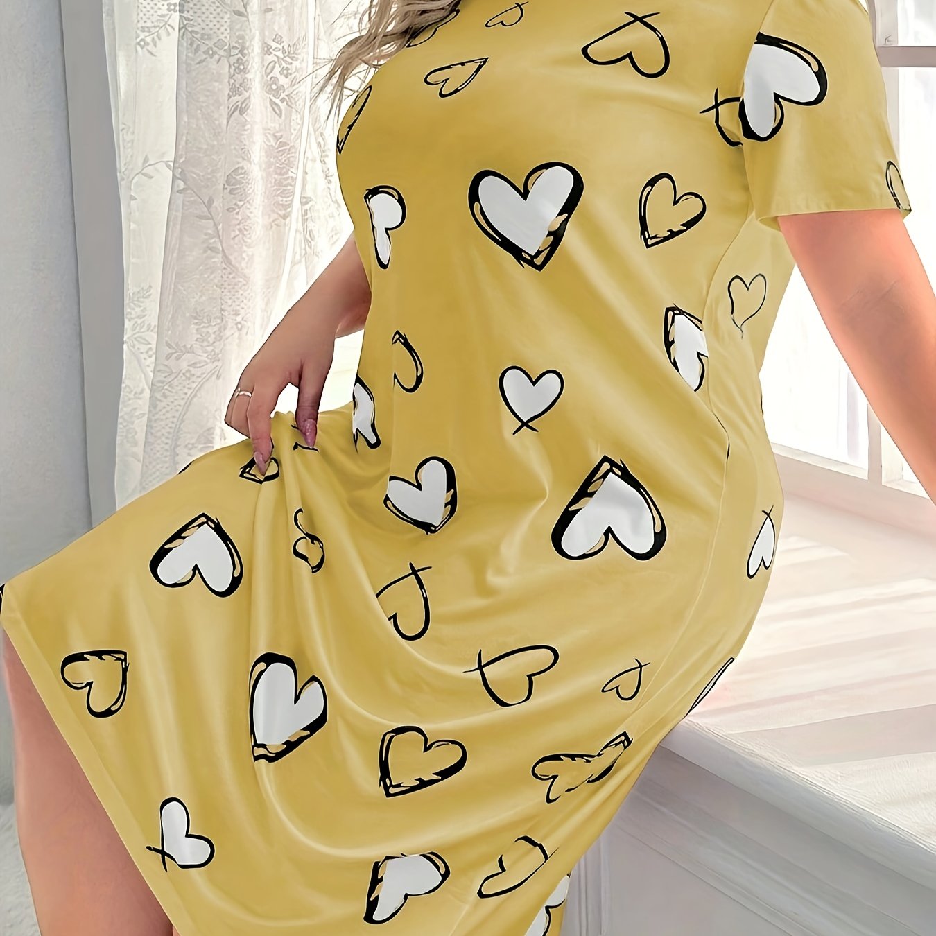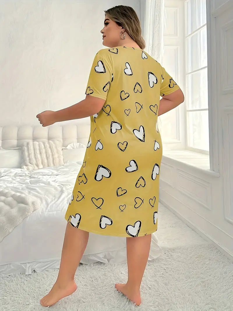 Plus Size Women's Sleep Dress Short Sleeve Heart Print Lounge Wear Pink Red