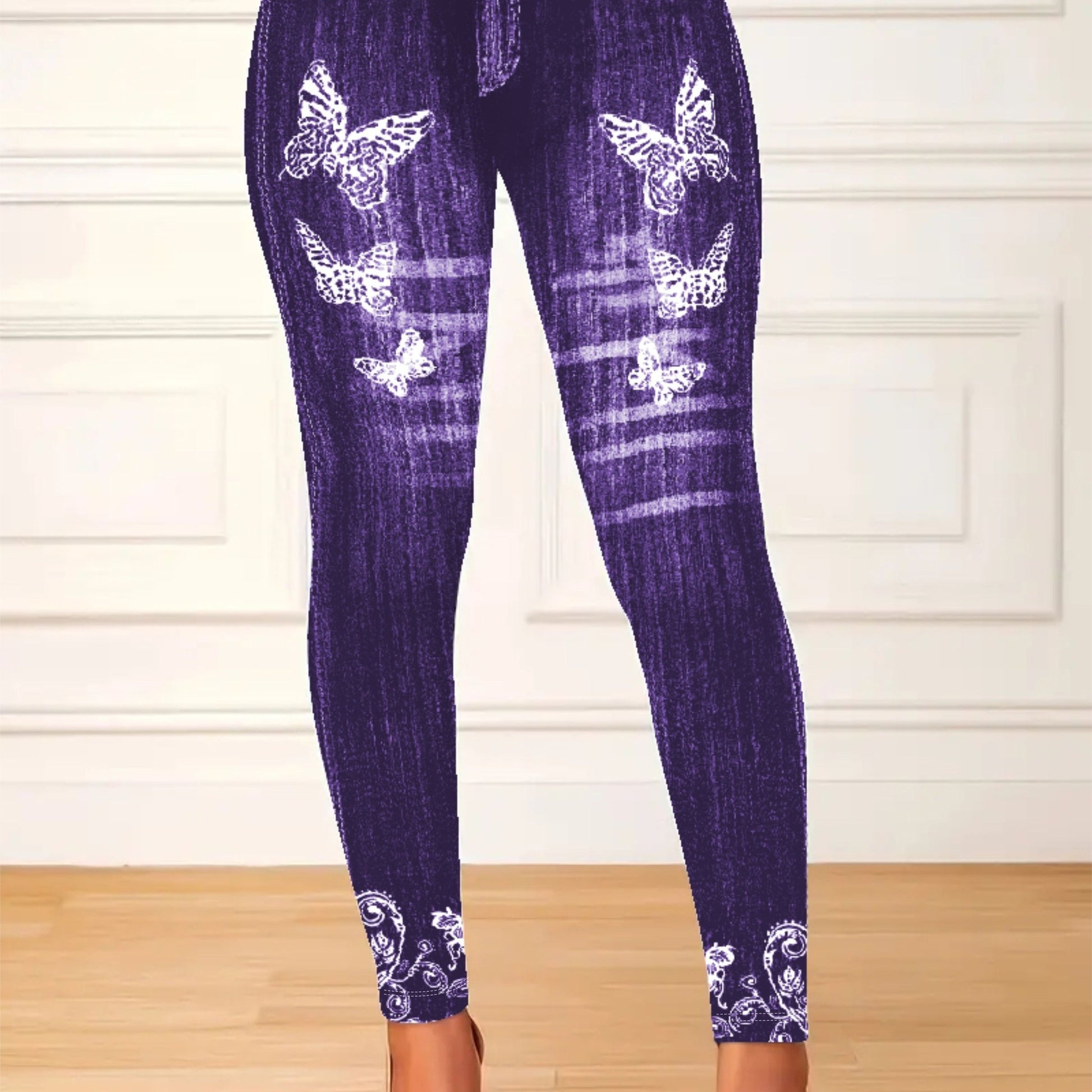 Plus Size Women's Stretchy Butterfly and Denim Print High Waist Leggings