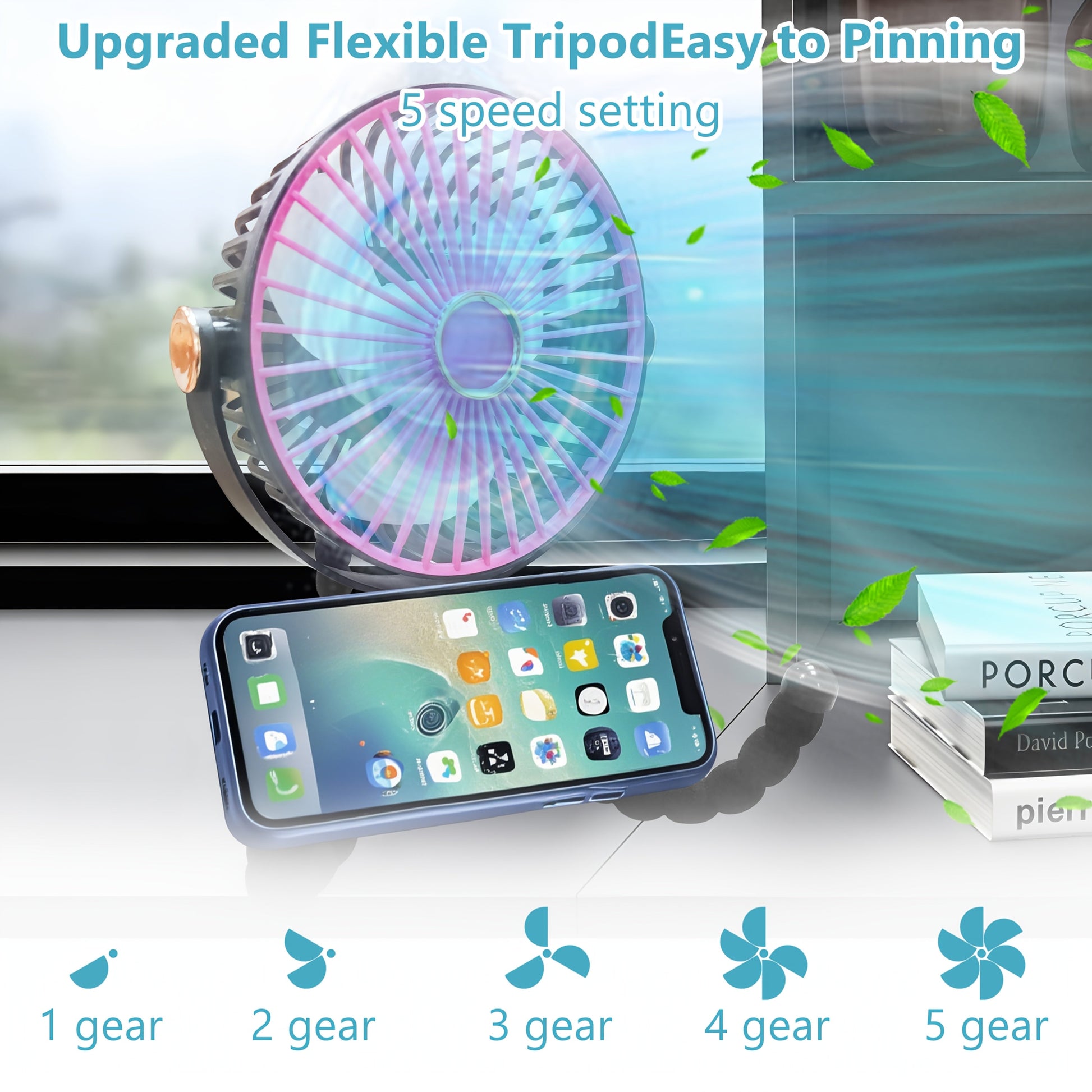 Portable Handheld Fan with Adjustable Tripod, 5-Speed, USB Rechargeable, Compact Folding Design