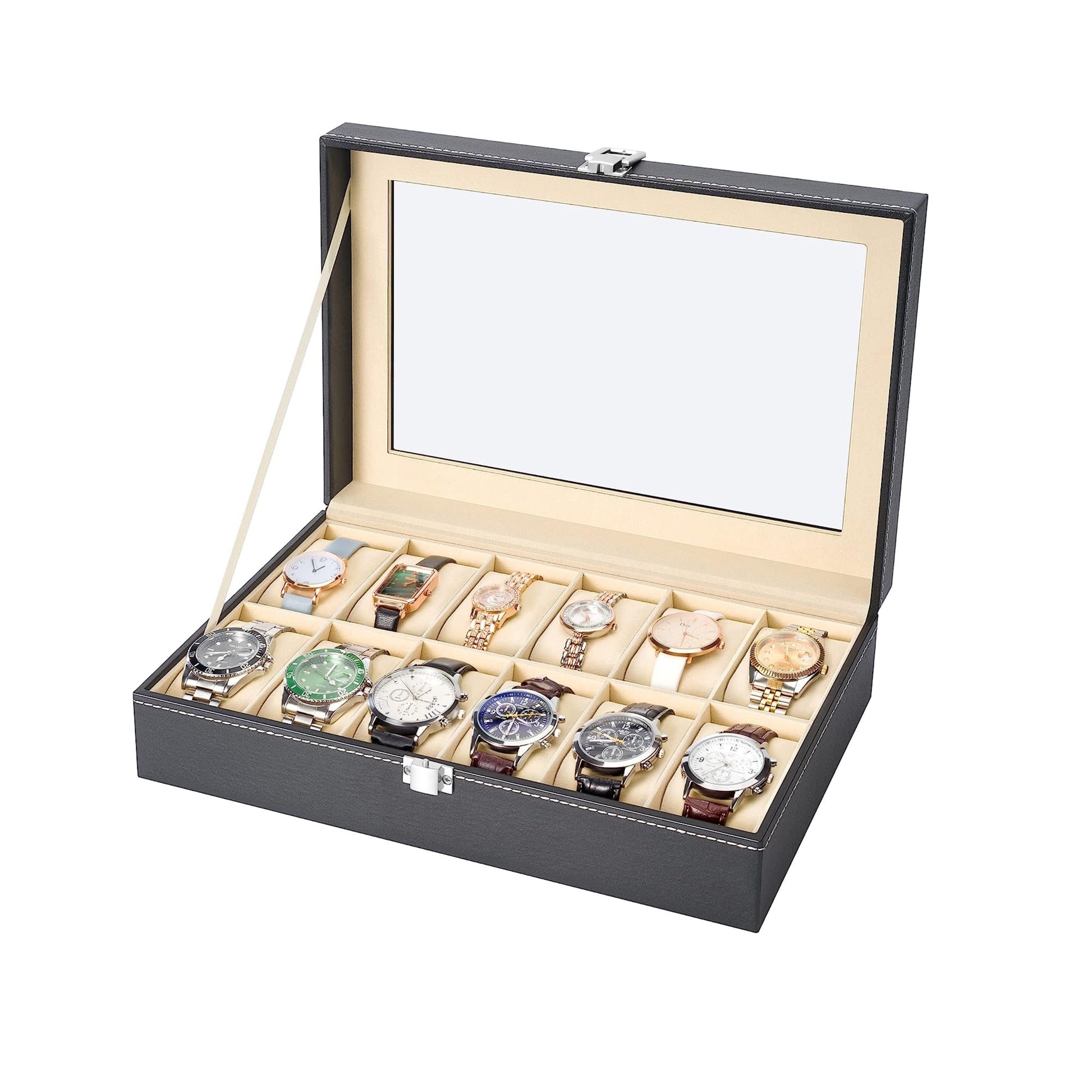 Leather Watch Storage Box with Glass Top for 1, 6, 12, or 24 Watches