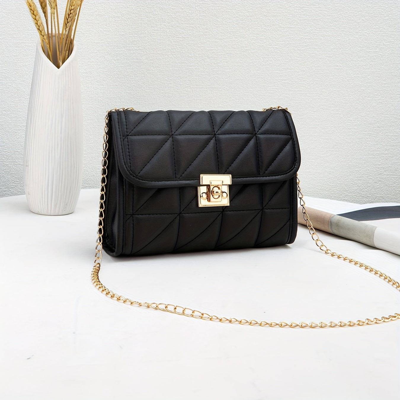 Quilted Crossbody Bag with Chain Strap Lock Closure Faux Leather Solid Color for Women