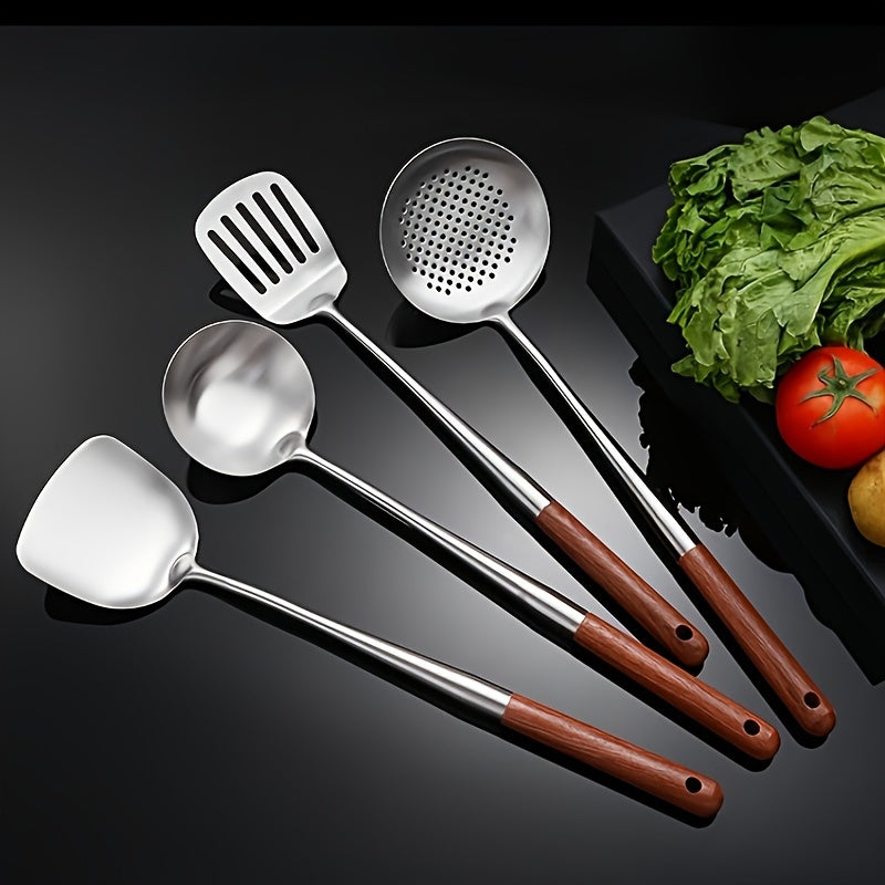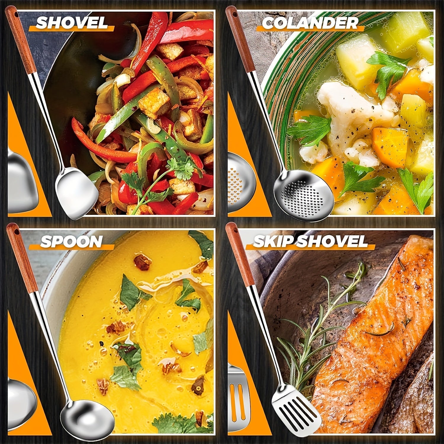Set of 4 Stainless Steel Wok Utensils with Wooden Handles, 43cm Long, Heat-Resistant