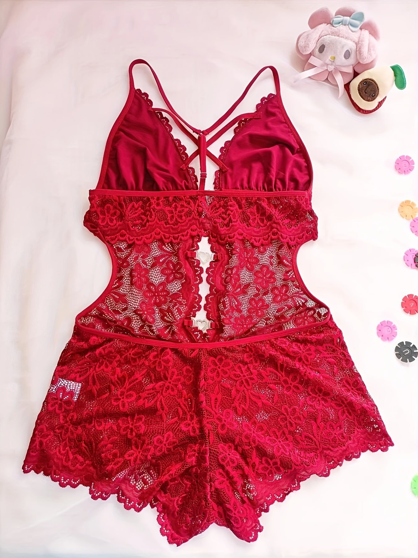 Lingerie Women's Lace Teddy with Heart Decor and Deep V Backless Bodysuit