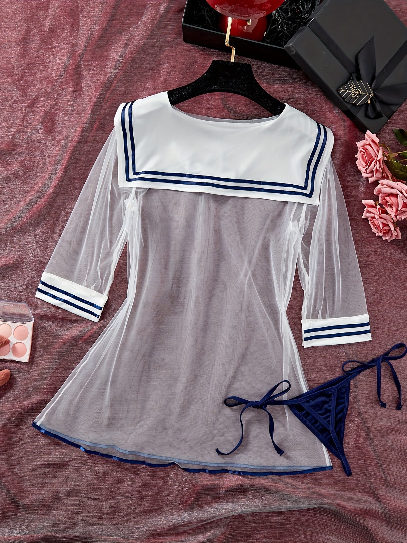 Sexy Preppy Sailor Cosplay Costume Sheer Mesh Dress with Thong
