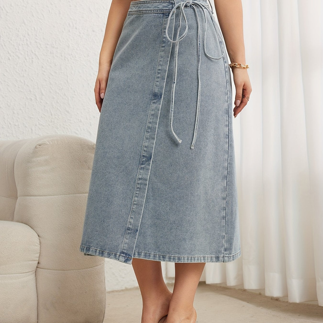 Women's High Waist Denim Skirt Midi Asymmetrical Drawstring Front Split Solid Color Regular Fit