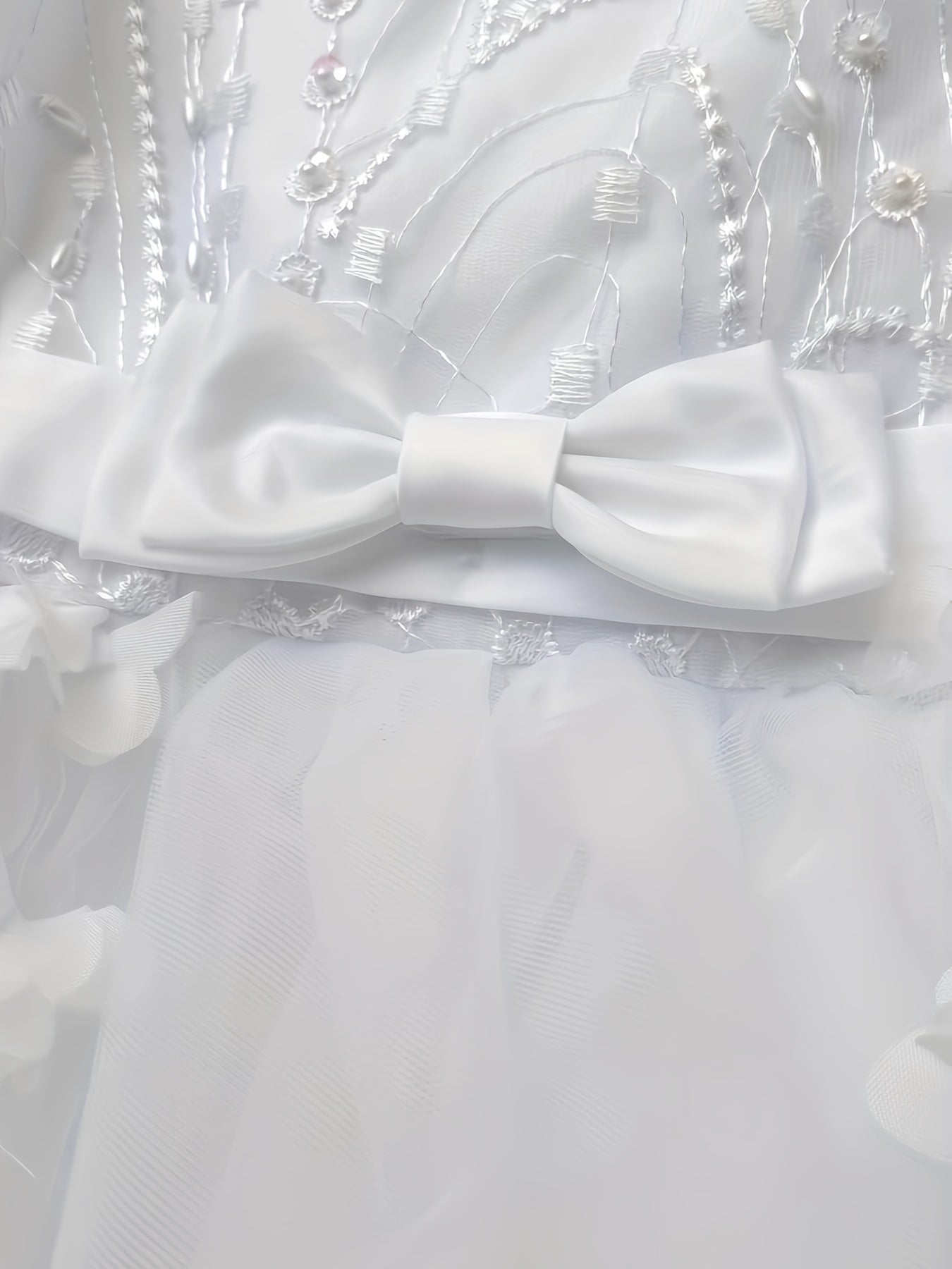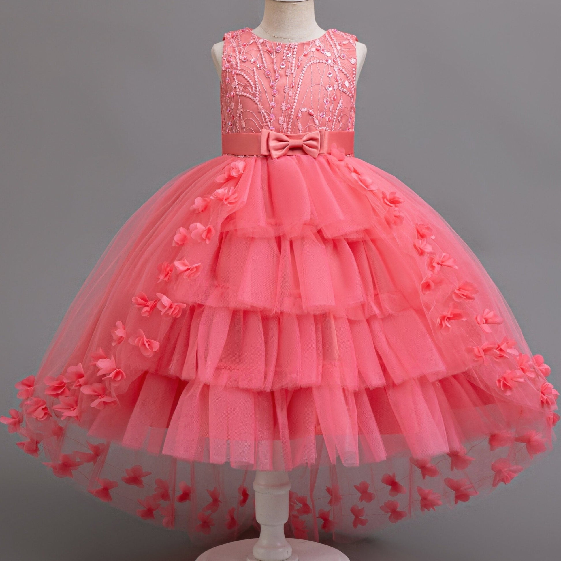 Girls Pink Princess Dress with Floral Appliqués Tulle Overlay Bow for Parties and Pageants