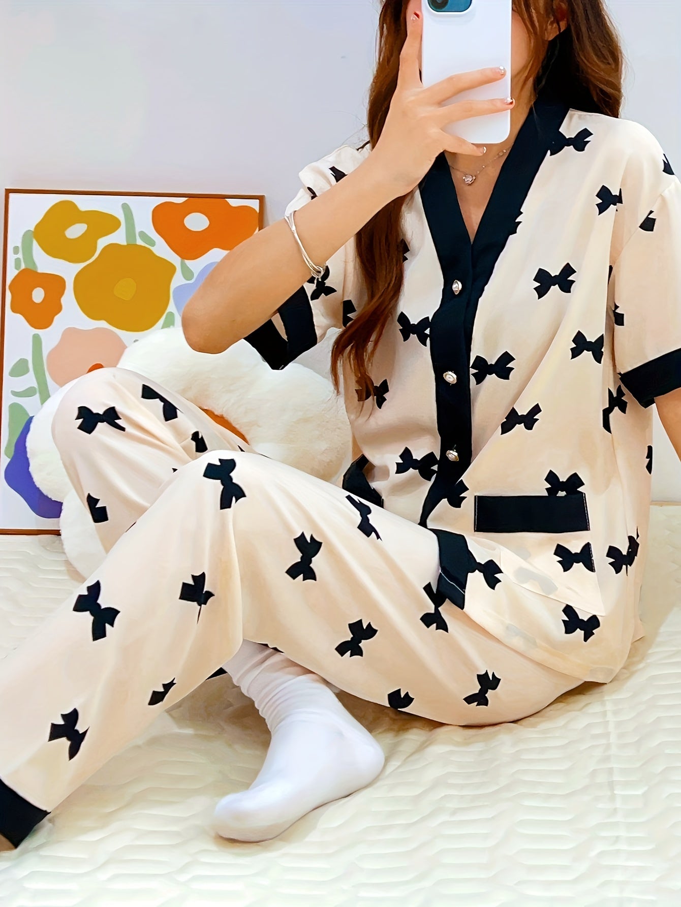 Women's Summer Pajama Set with Heart Pattern Short Sleeve V-Neck Cardigan and Long Pants