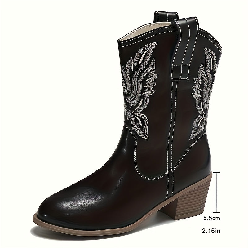 Women Mid-Calf Embroidered Boots Synthetic Slip-On Western Style Leather Sole