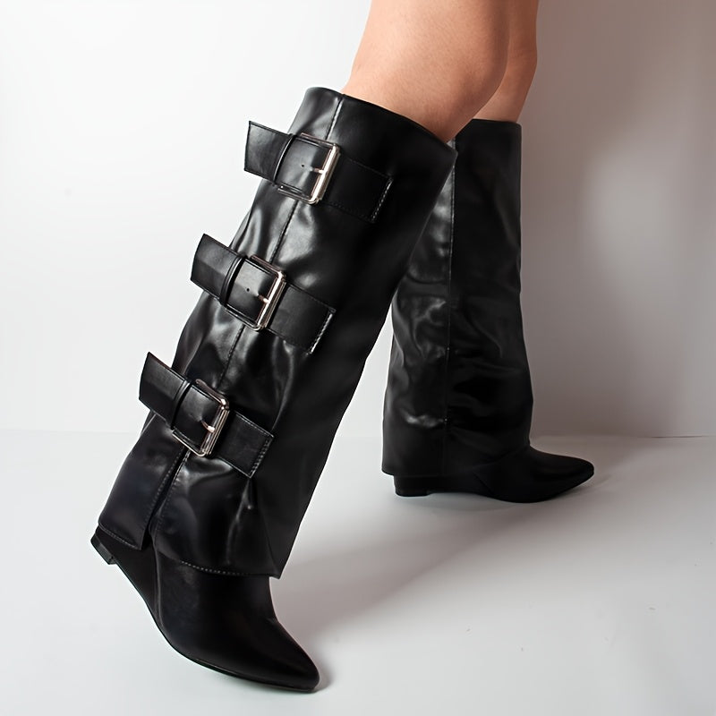 Women's Black Faux Cover Knee-High Boots with Buckle Straps and Wedge Heel