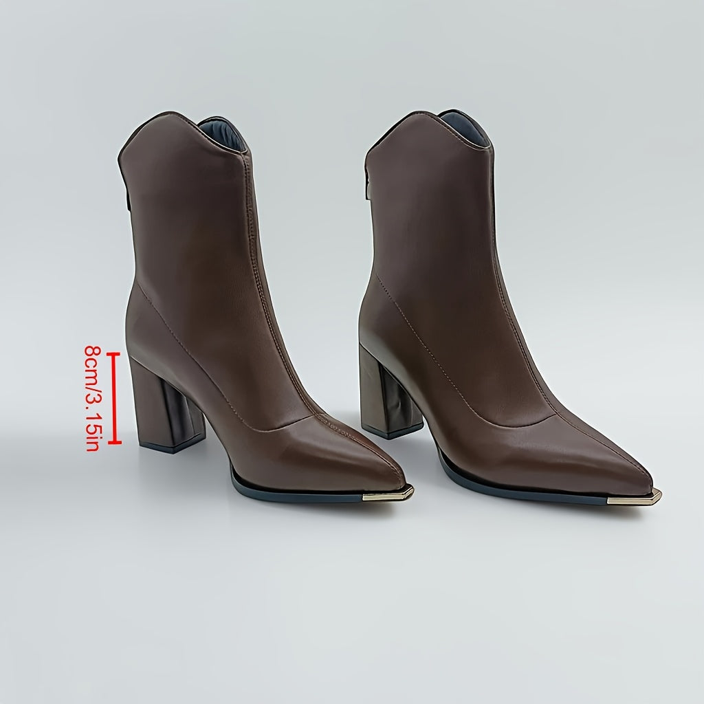 Women's Brown Pointed Toe Chunky Heel Ankle Boots All-Season Faux Cover