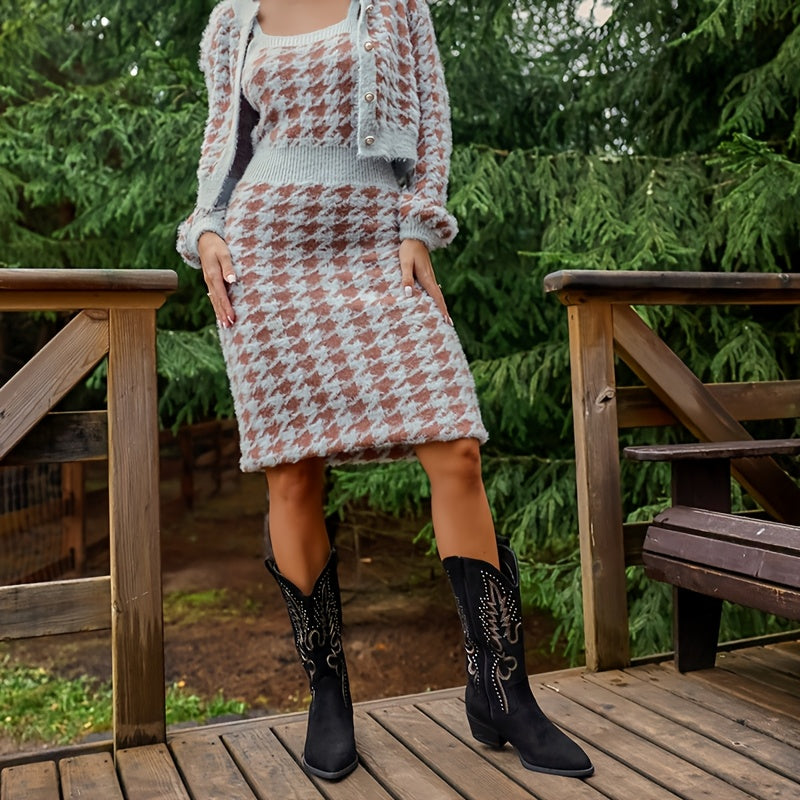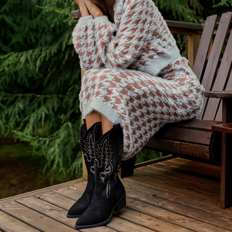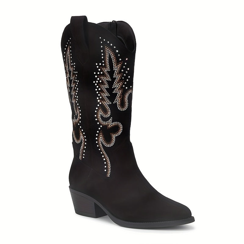 Women's Cowboy Boots Black Embroidered Ankle Zipper Pointed Toe Chunky Heel