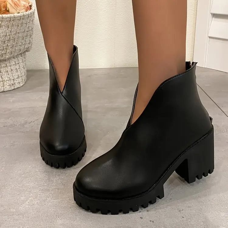 Women's Faux Cover Round Toe Chunky Ankle Boots Black Mid-Heel Durable