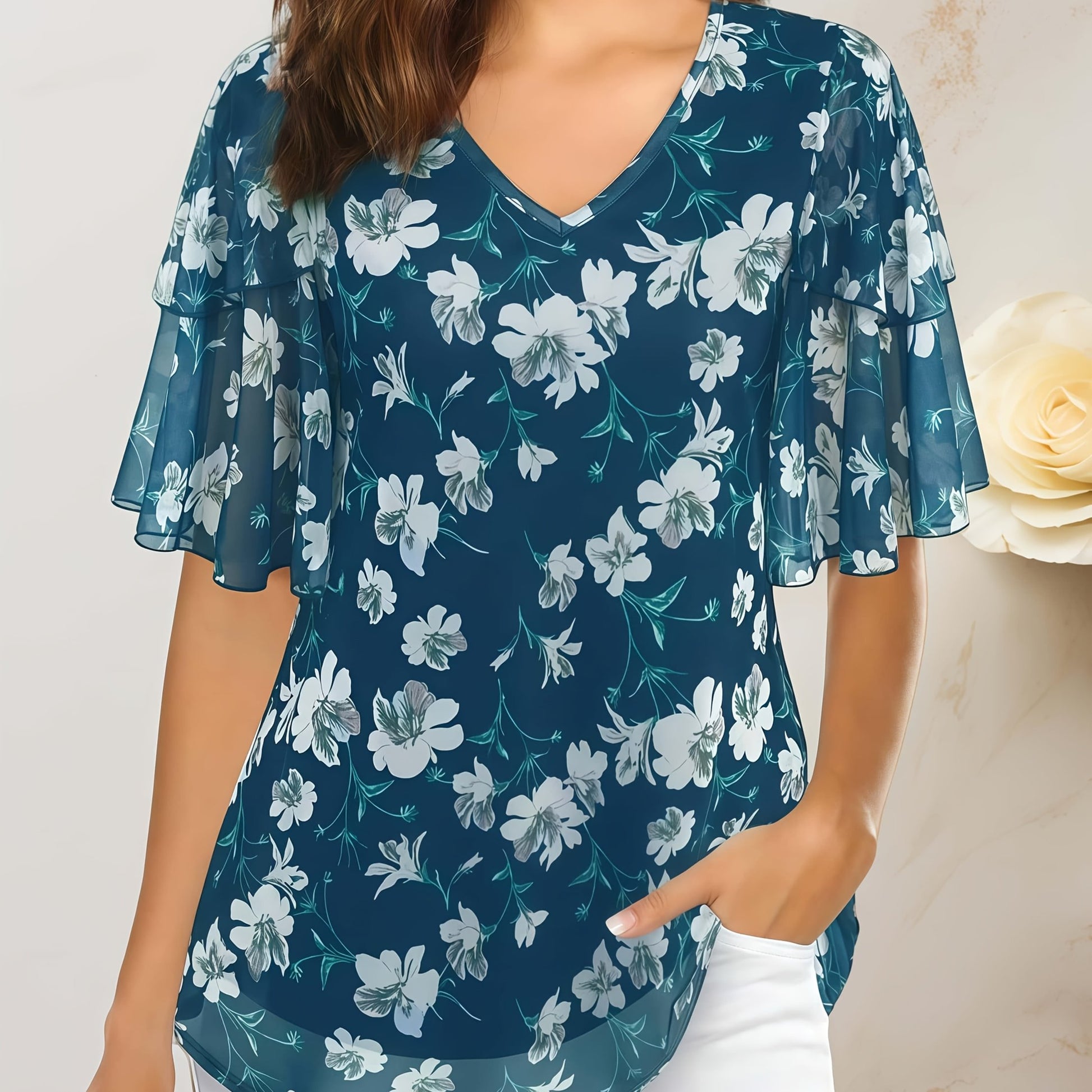 Women's Floral V-Neck Blouse with Ruffle Sleeves, Dark Blue, Short Sleeve