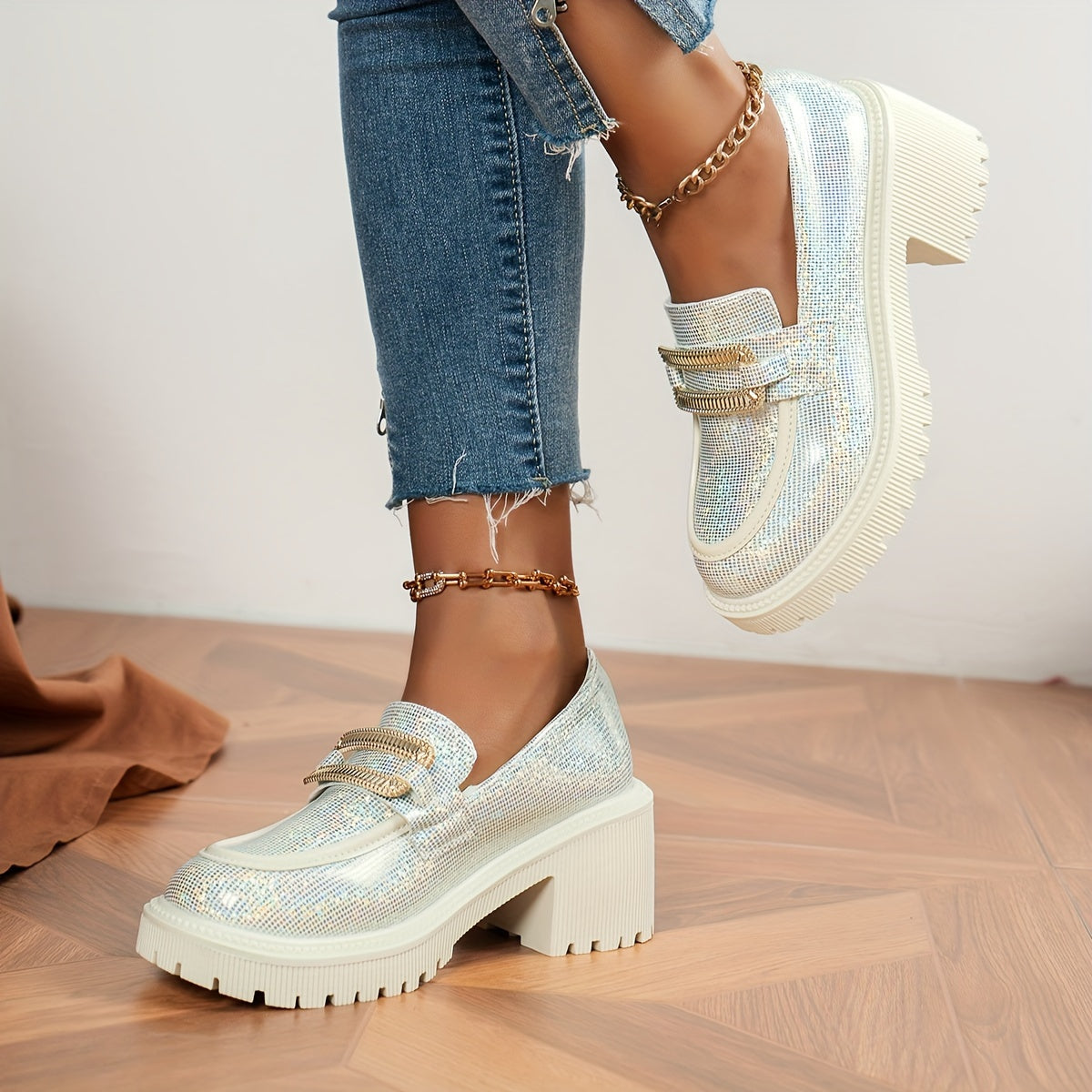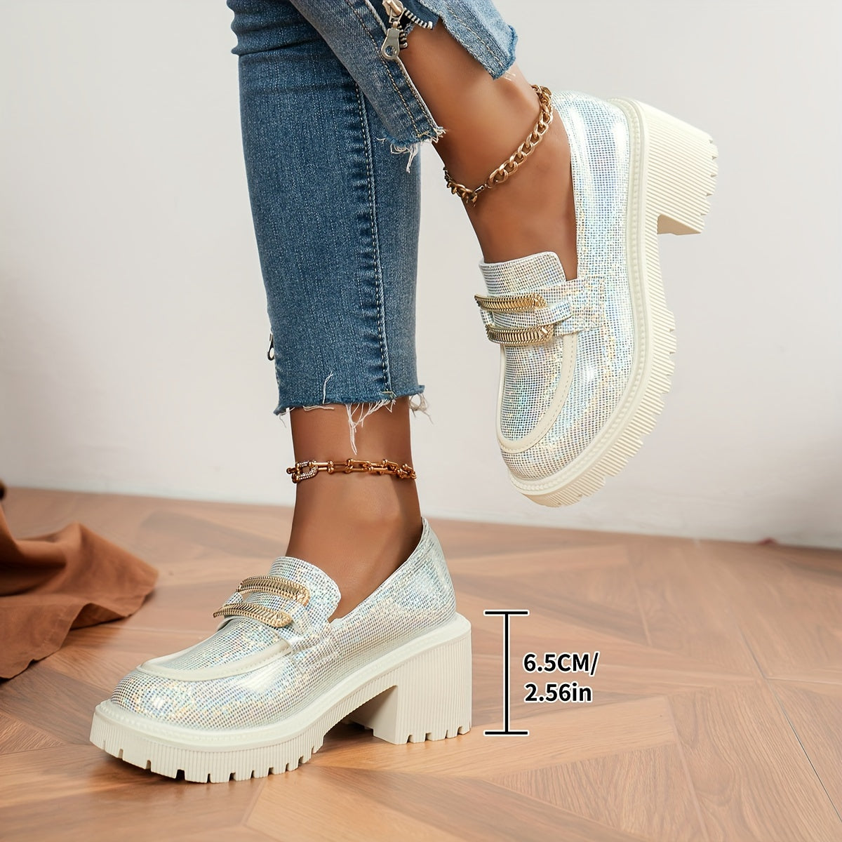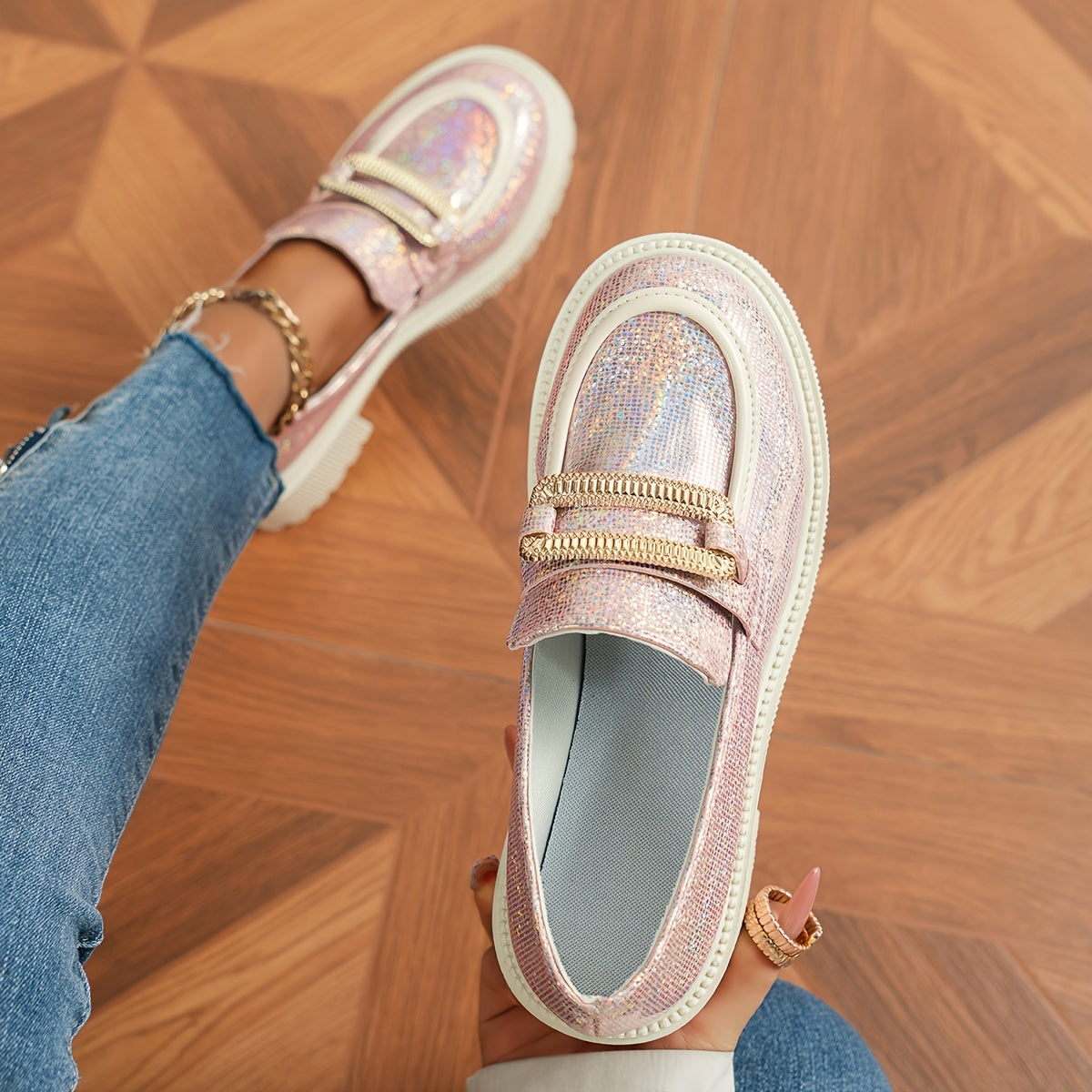 Women's Glitter Loafers Pink Sequin Slip-On Shoes with Chunky Heel