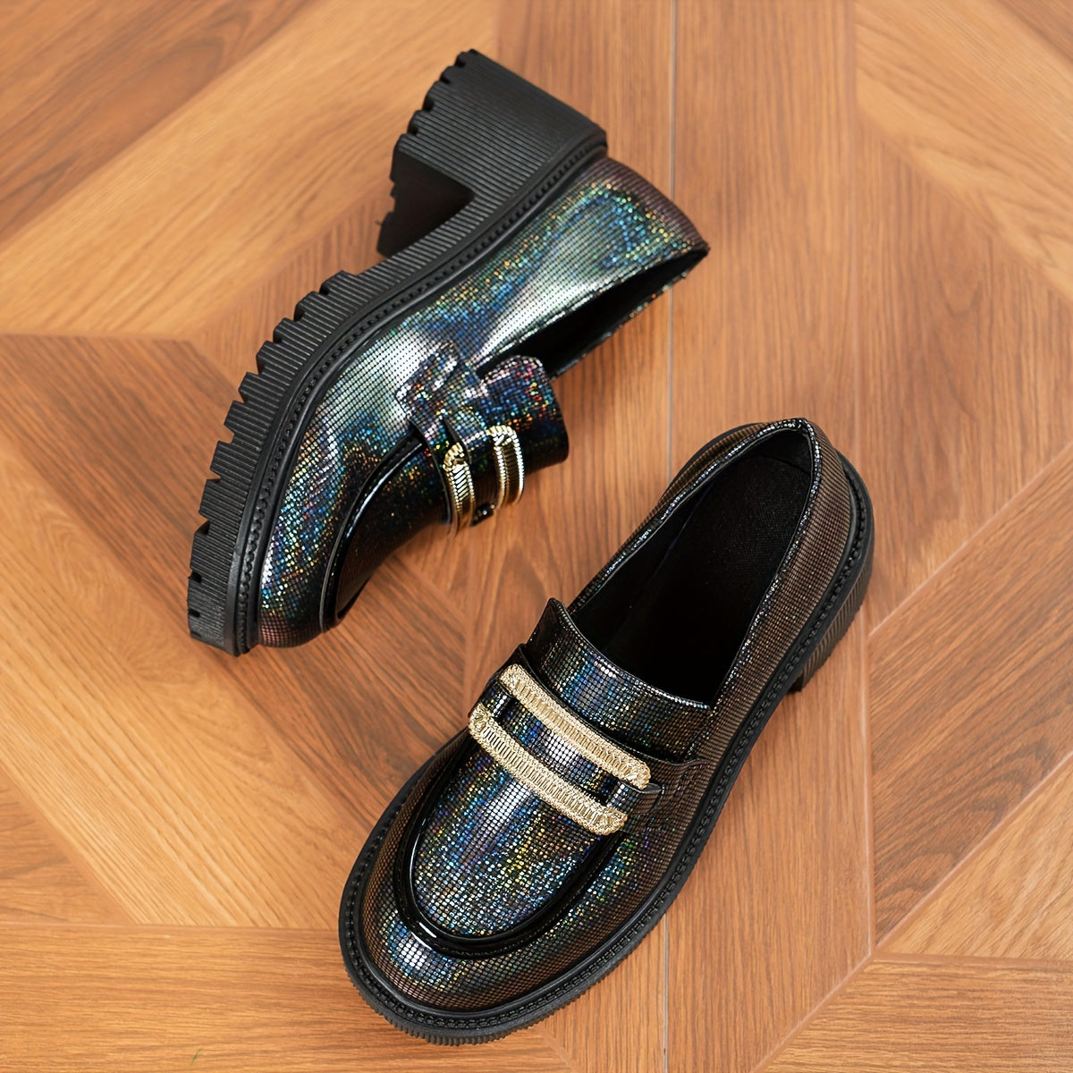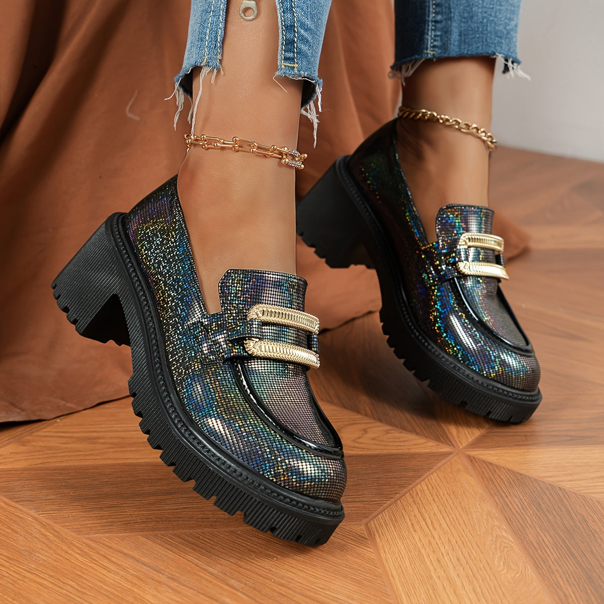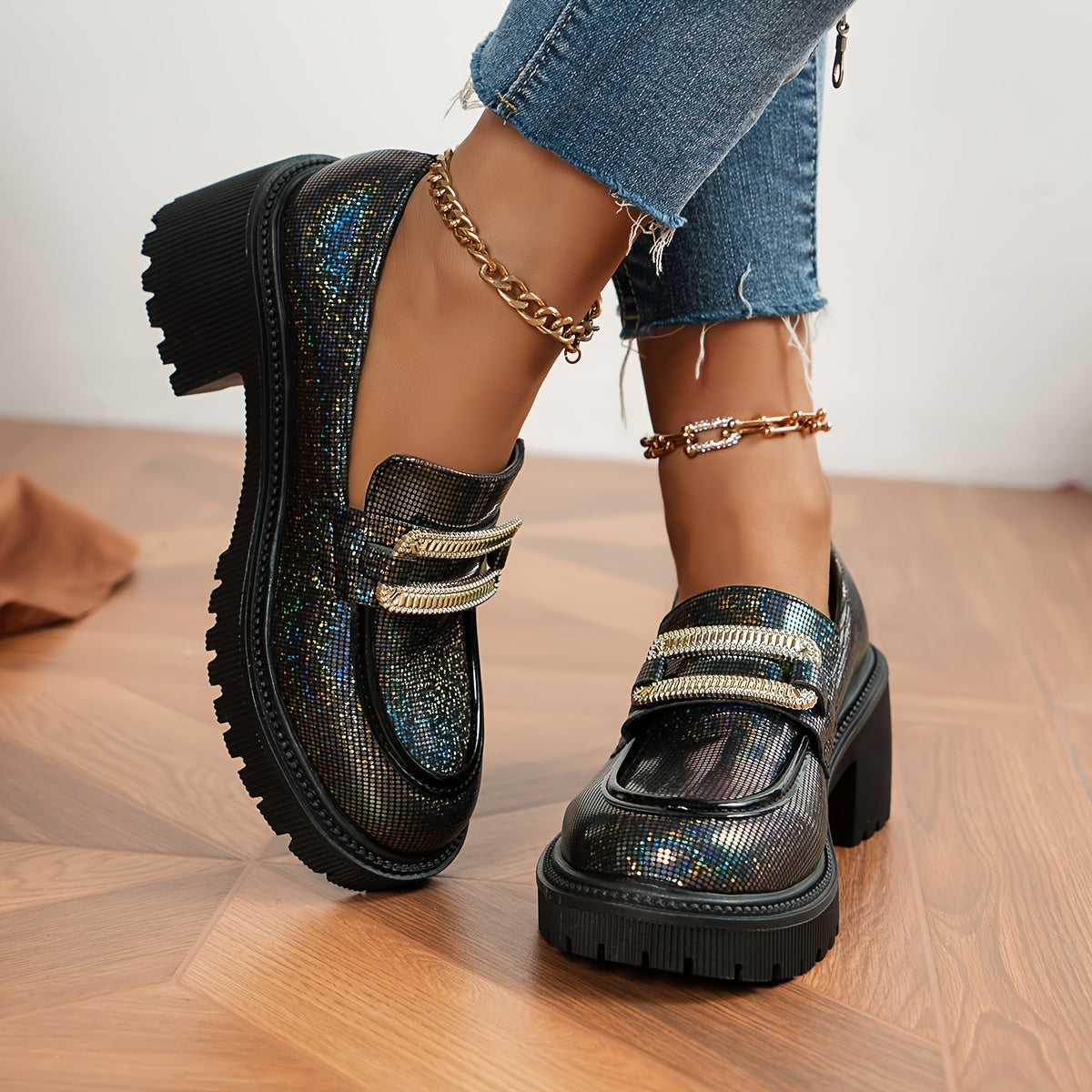 Women's Glitter Loafers Pink Sequin Slip-On Shoes with Chunky Heel