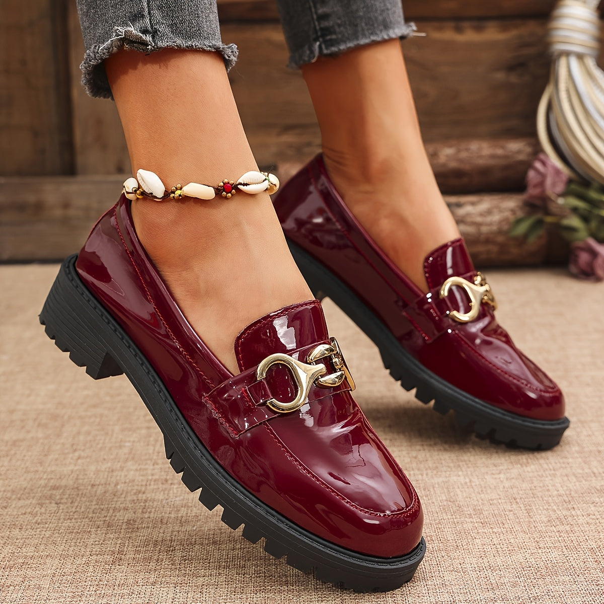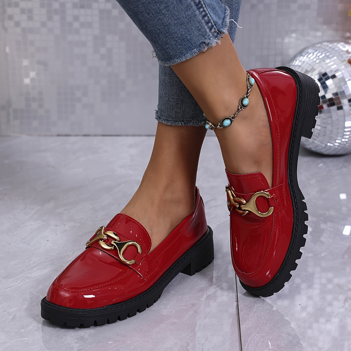 Women's Glossy Red Synthetic Penny Loafers Slip-On Shoes with Cushioned Sole