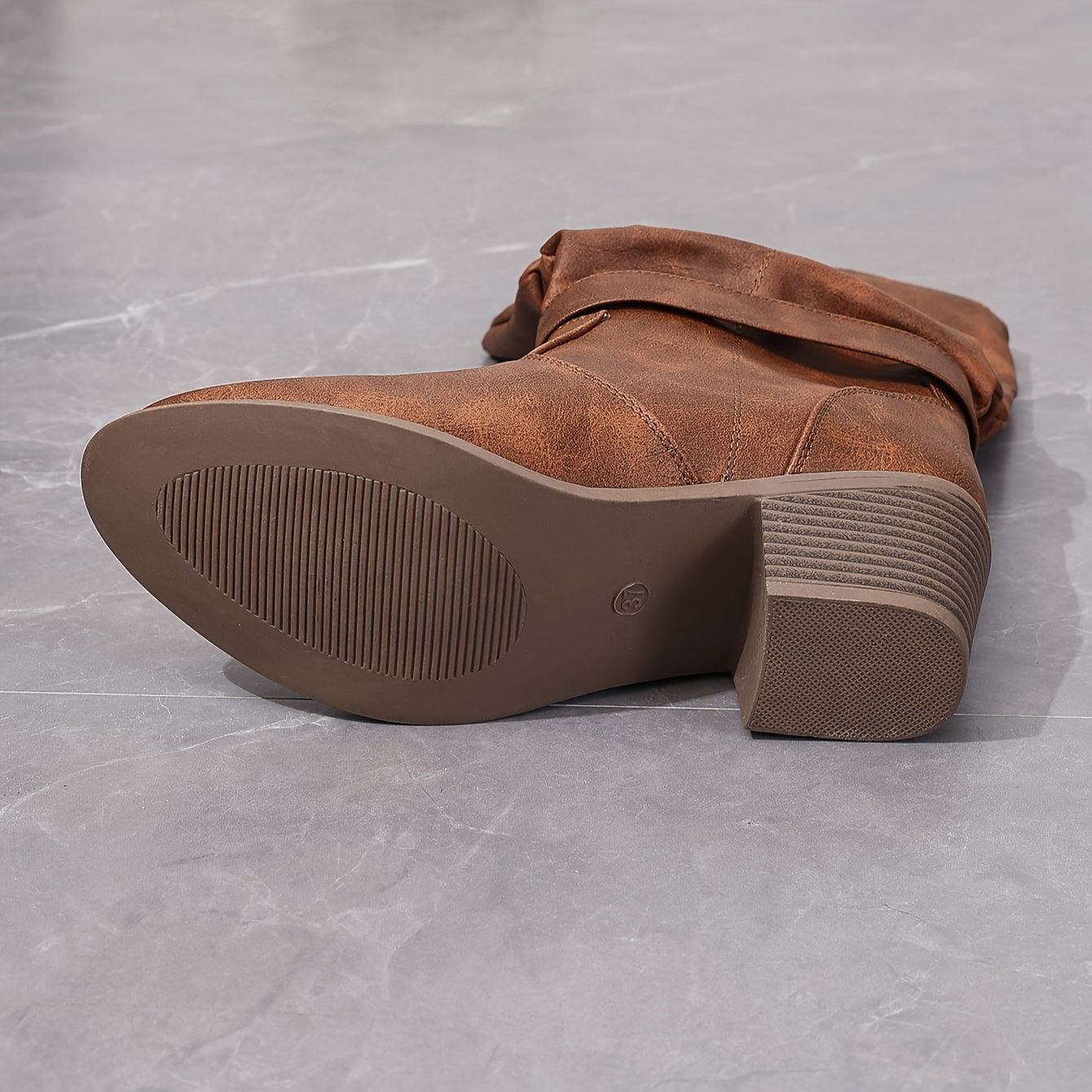 Women's Mid-Calf Faux Leather Slip-On Boots with Chunky Heel and Buckle