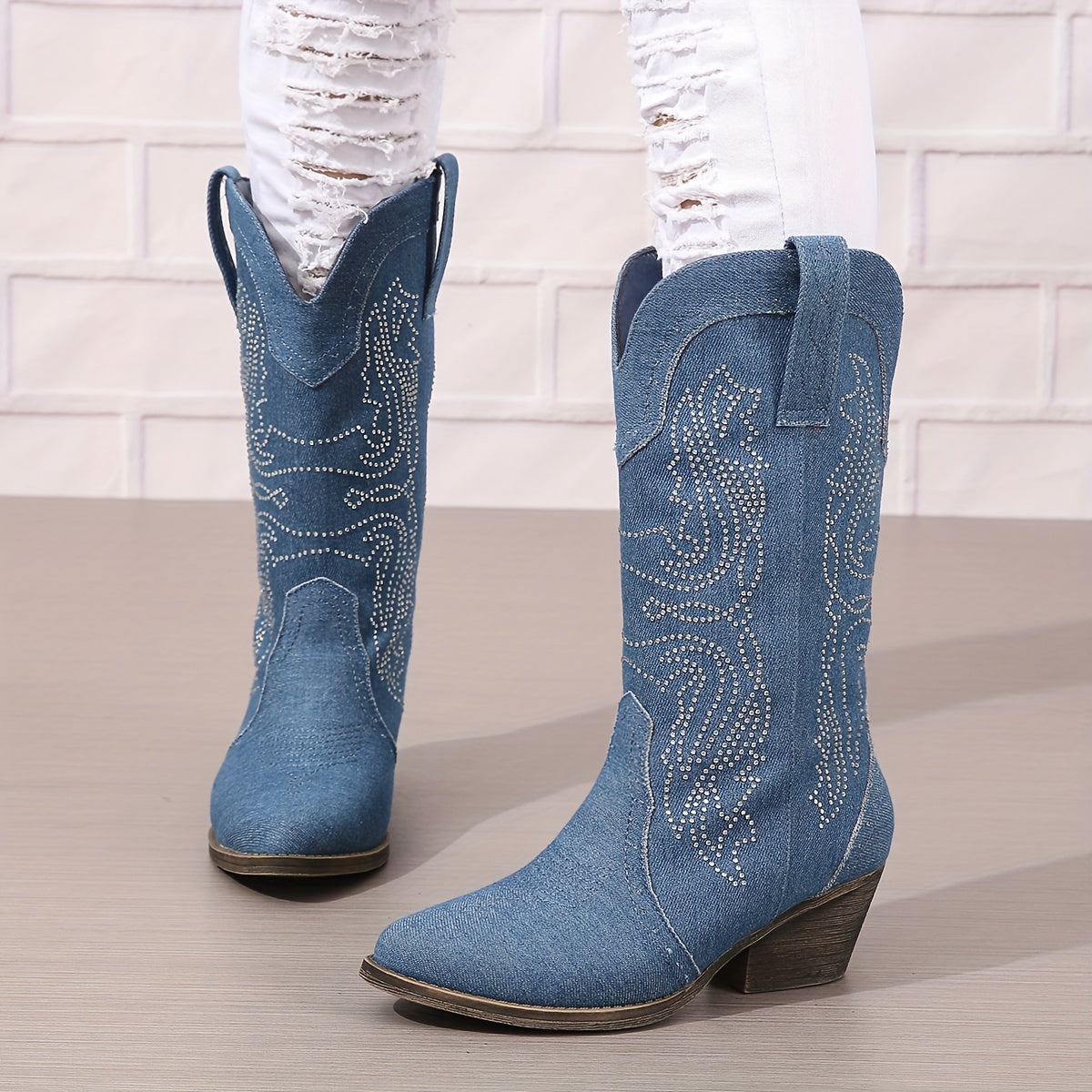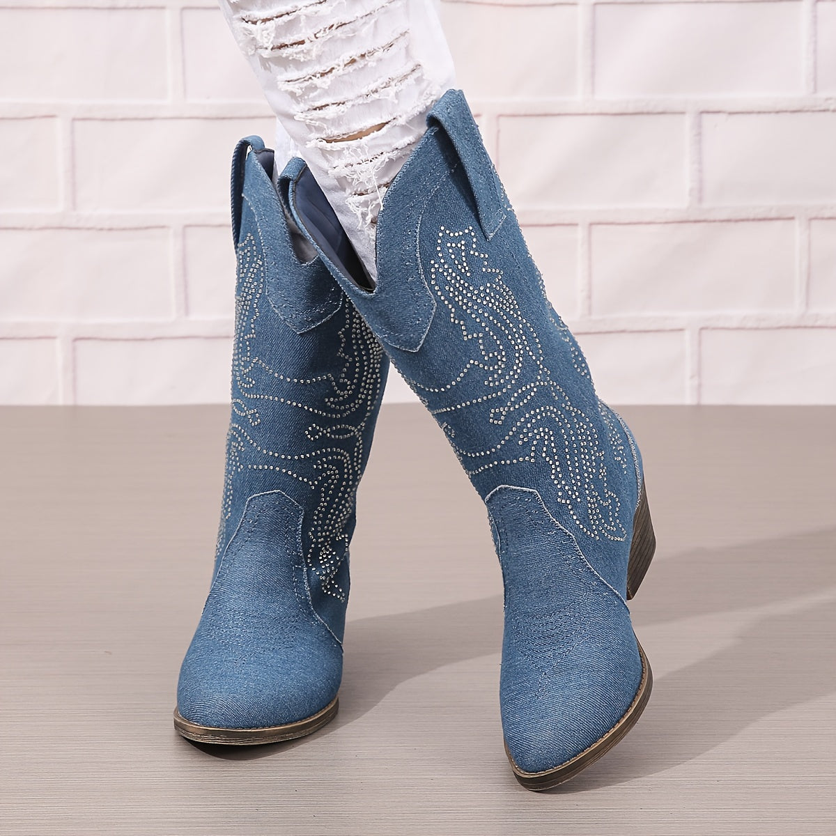 Women’s Mid-Calf Western Boots Fabric Floral Pointed Toe Winter