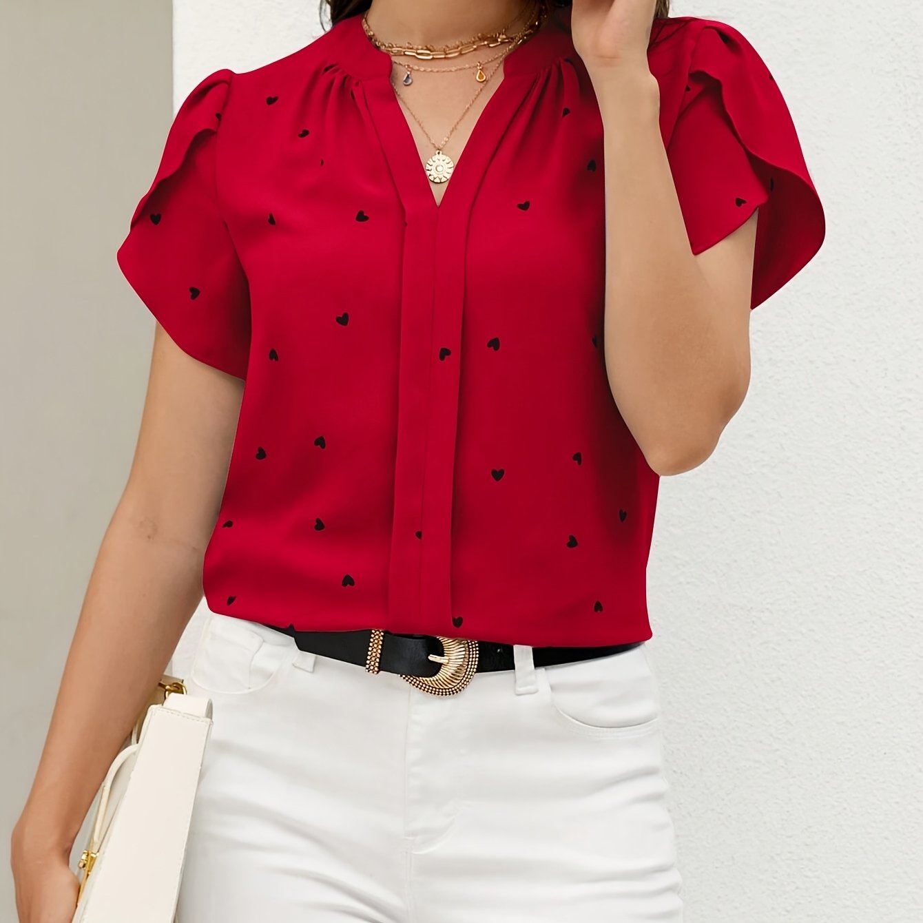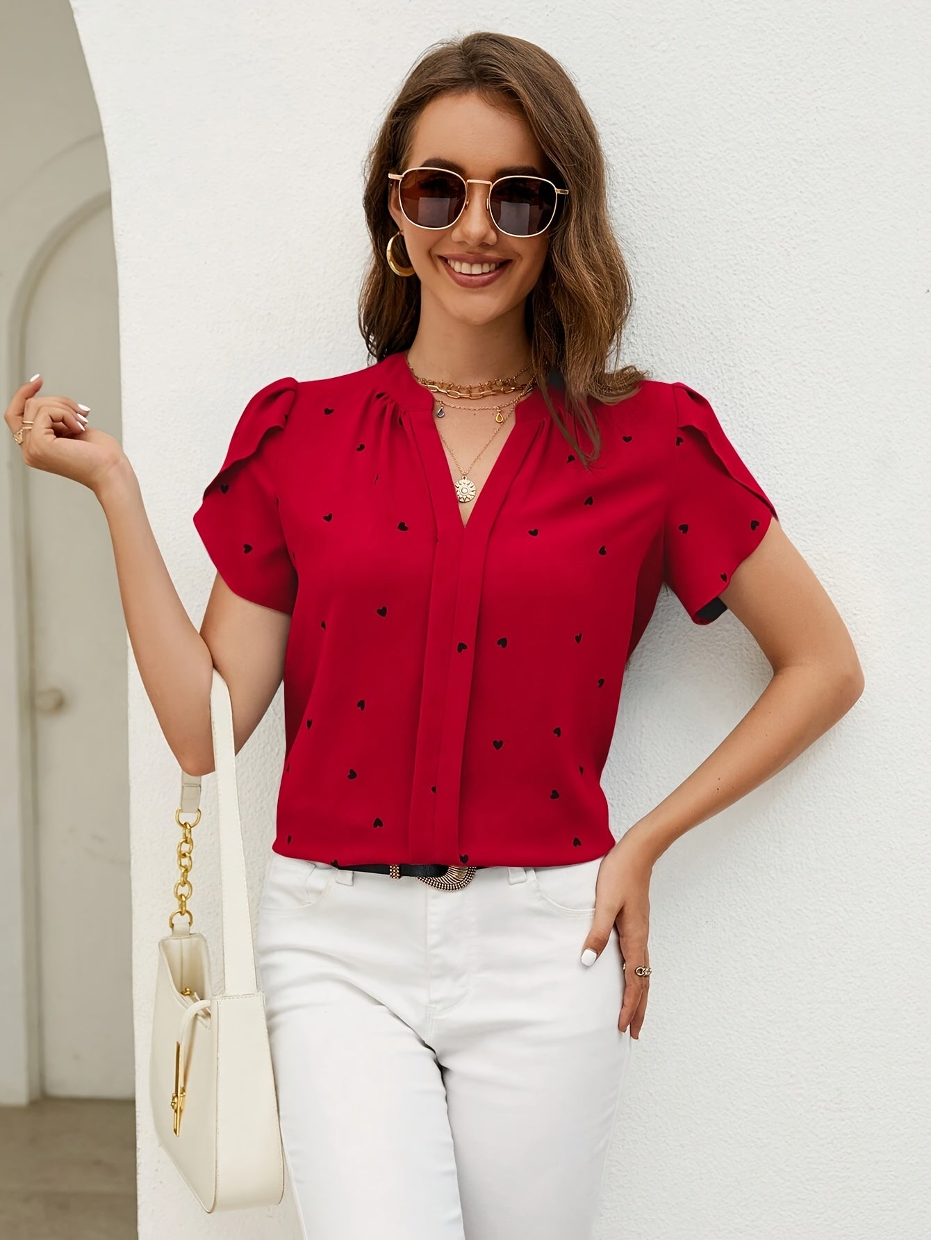 Women's Plus Size Light Blue Heart Print V-Neck Blouse Casual Summer Top
