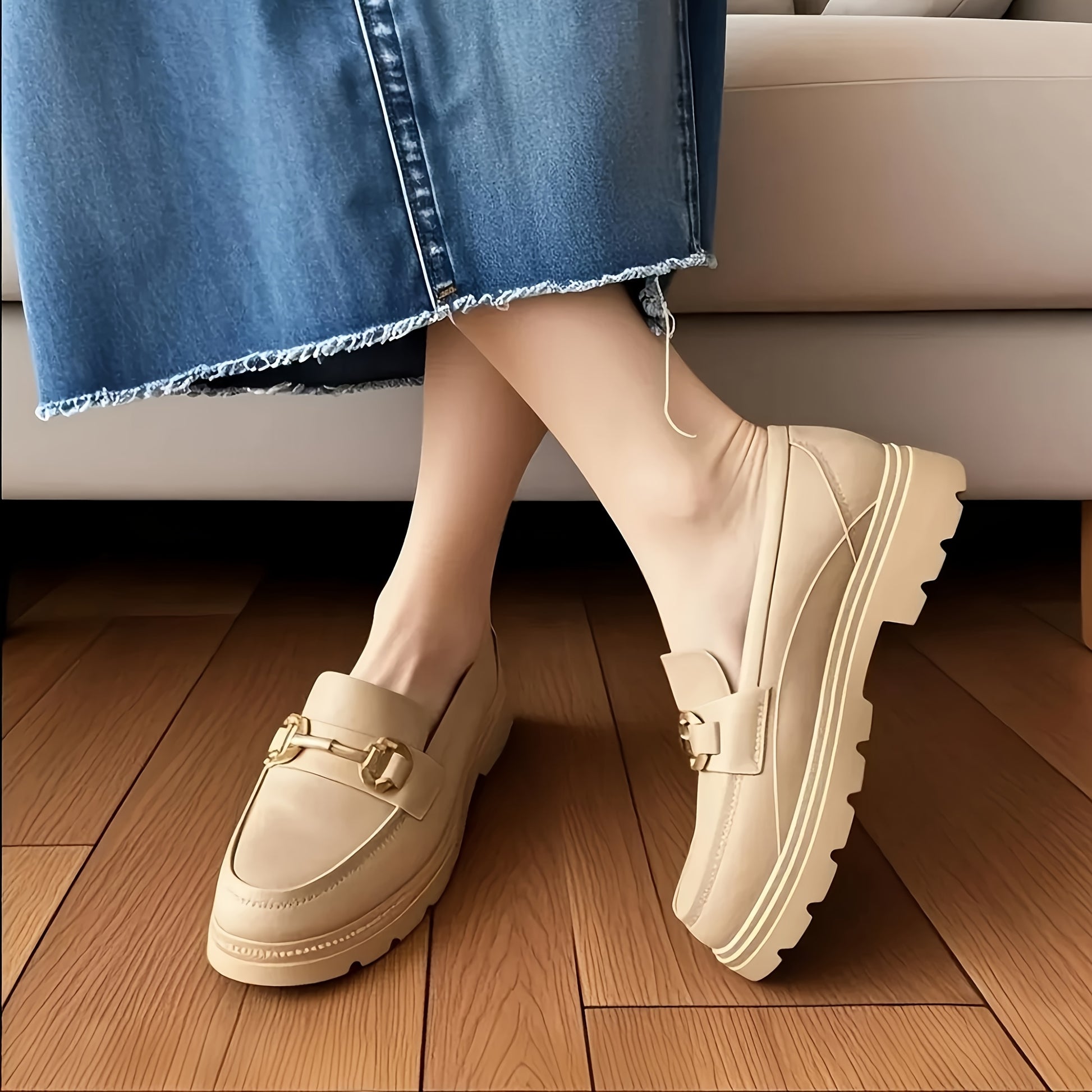 Women's Retro French-Inspired Slip-On Loafers Beige EVA Rubber Sole