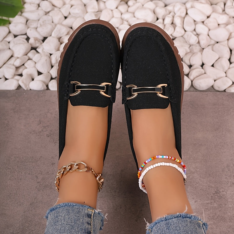 Women's Slip-On Loafers with Metallic Buckle Beige Black Comfortable Flats