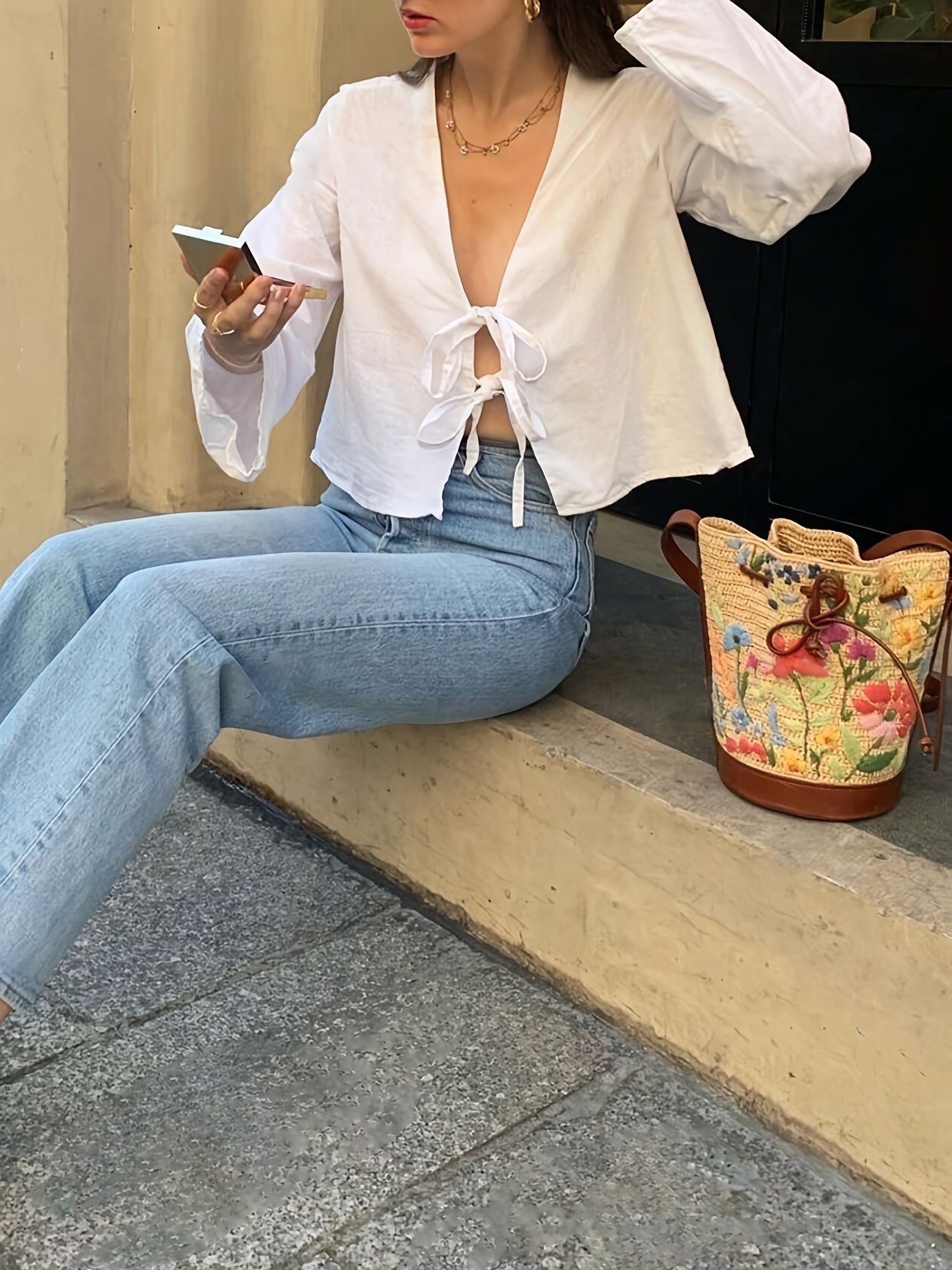 Women's V-Neck Tie Front Polyester Shirt Solid Color Spring Fall Adult Sizes