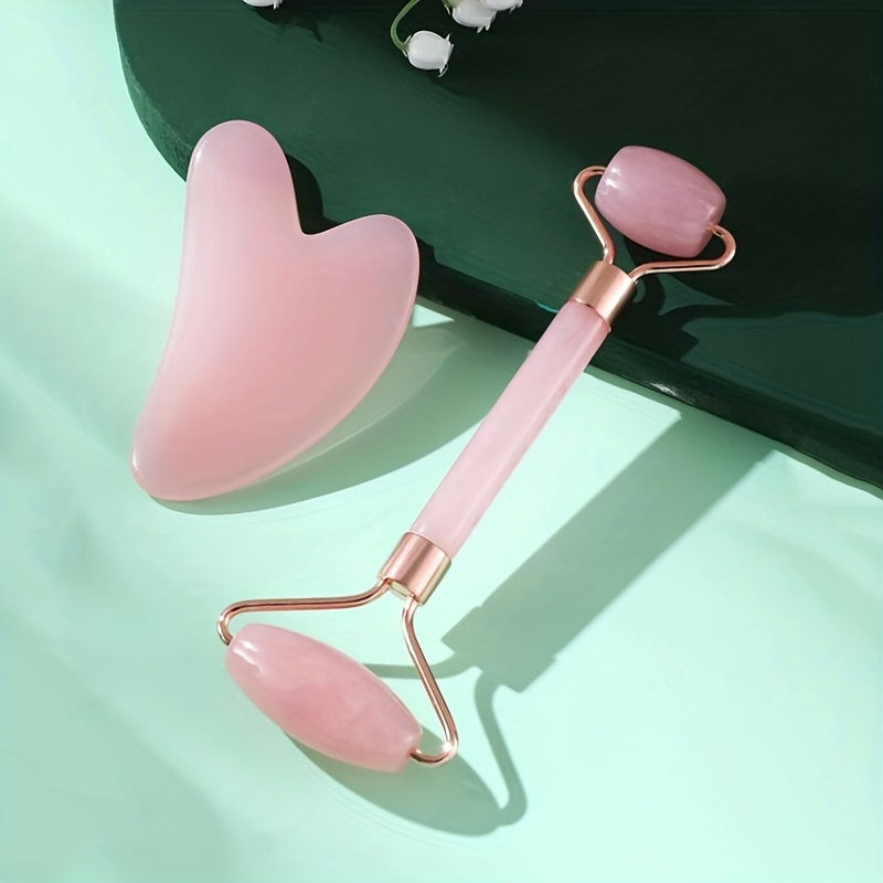 2pcs Rose Quartz Facial Roller Set with Heart-Shaped Gua Sha for Face and Eye Massage