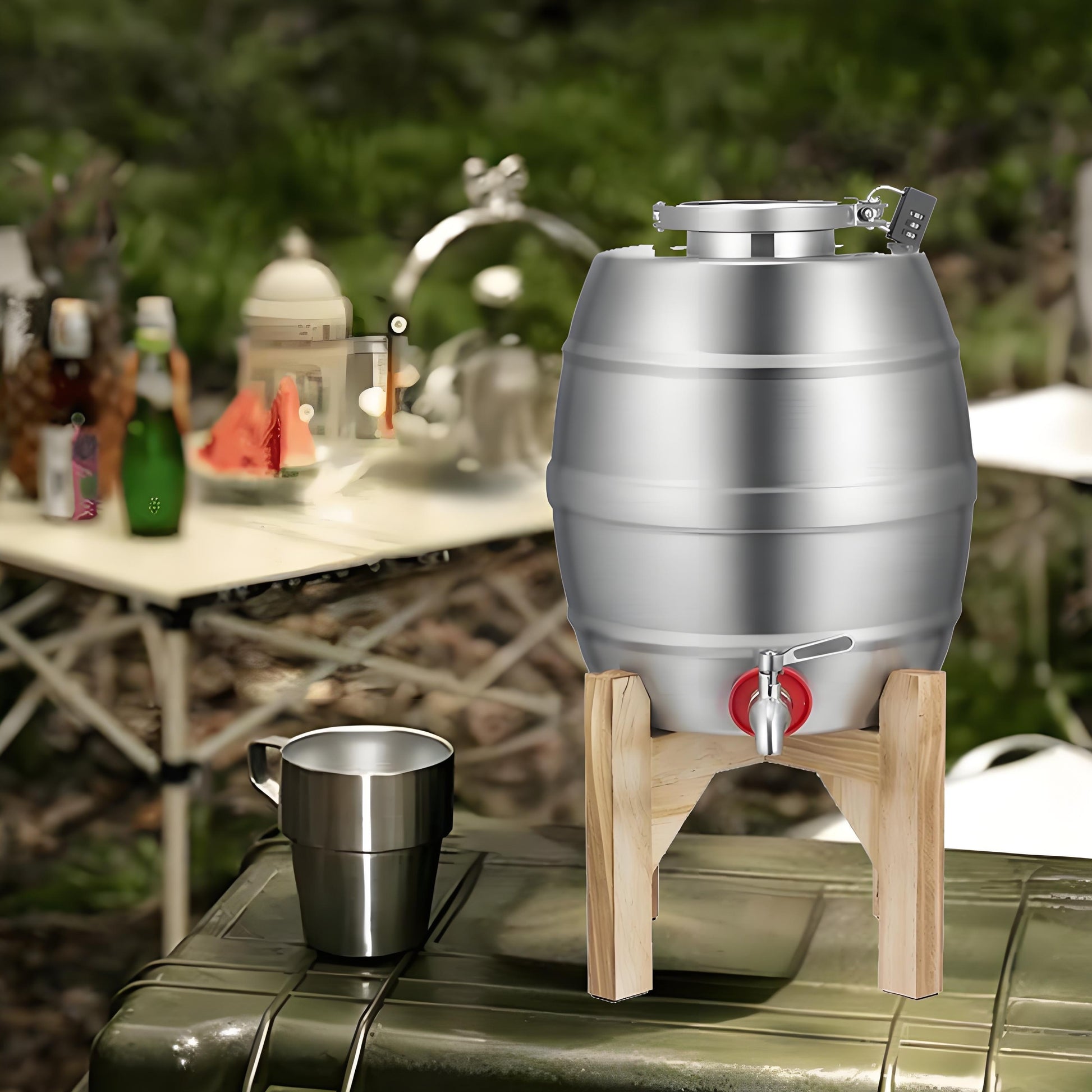 5L Stainless Steel Oval Wine Barrel with Tap Wooden Stand and Lock for Liquor Storage